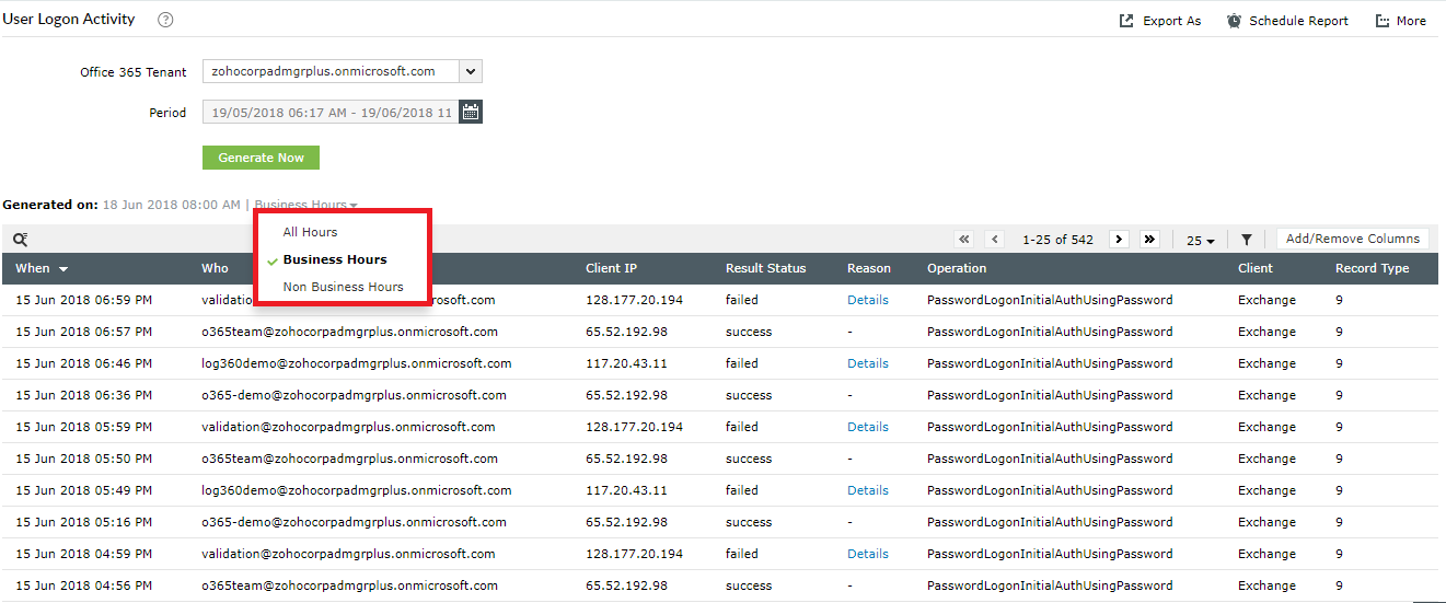 Con O365 Manager Plus, una volta configurate le ore lavorative, è possibile recuperare i dati di controllo degli accessi degli utenti durante le ore non lavorative in un solo clic. È inoltre possibile tener traccia dell'attività utente al di fuori delle ore lavorative per accertarsi che i dipendenti non siano coinvolti in attività dannose.