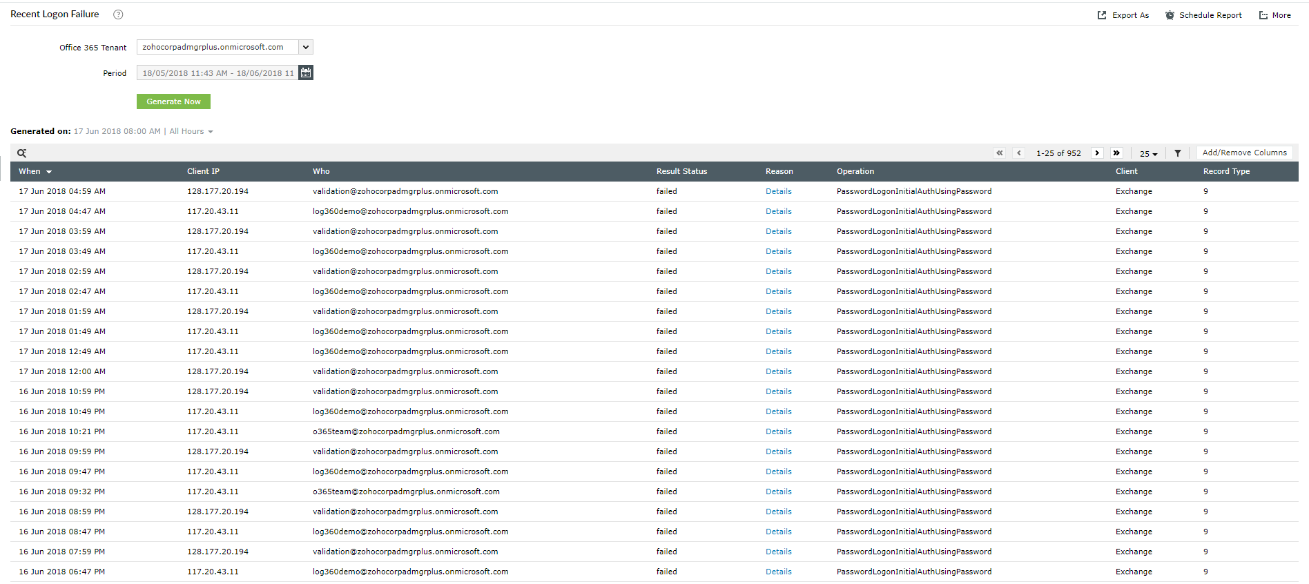 I ripetuti tentativi di accesso non riusciti di un solo account in un breve periodo di tempo indicano un attacco di forza bruta. Con il report Errori di accesso recenti di O365 Manager plus è possibile tenere traccia del numero insolito di tentativi di accesso non riusciti. Questo report fornisce dettagli sull’account utente compromesso, sull’indirizzo IP della macchina utilizzata per l'accesso, sulla data e l’ora del tentativo e altro ancora.