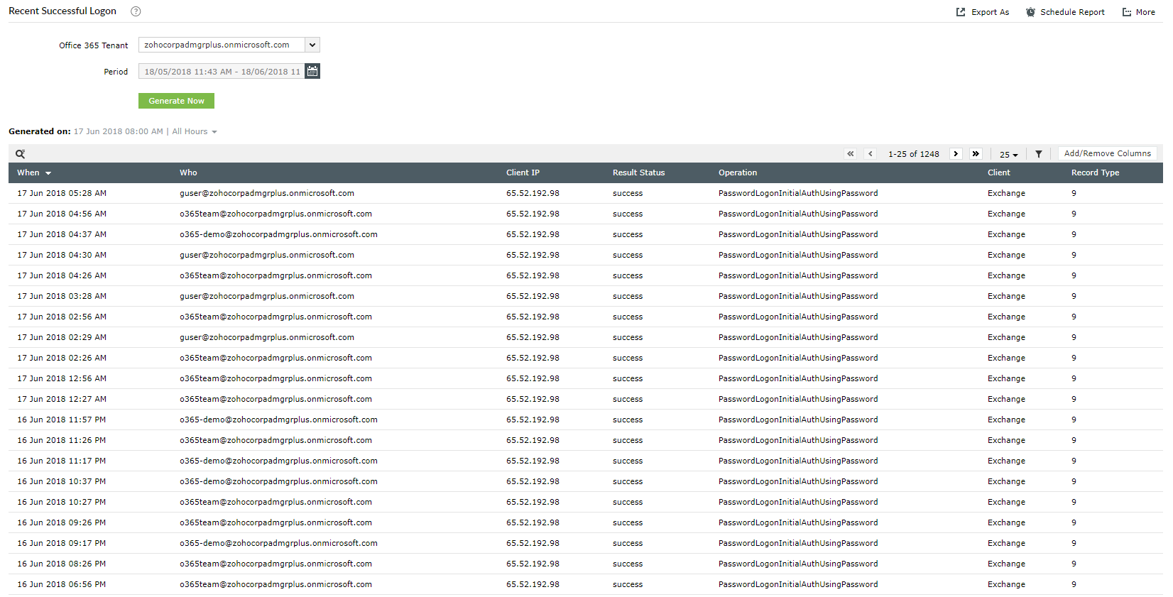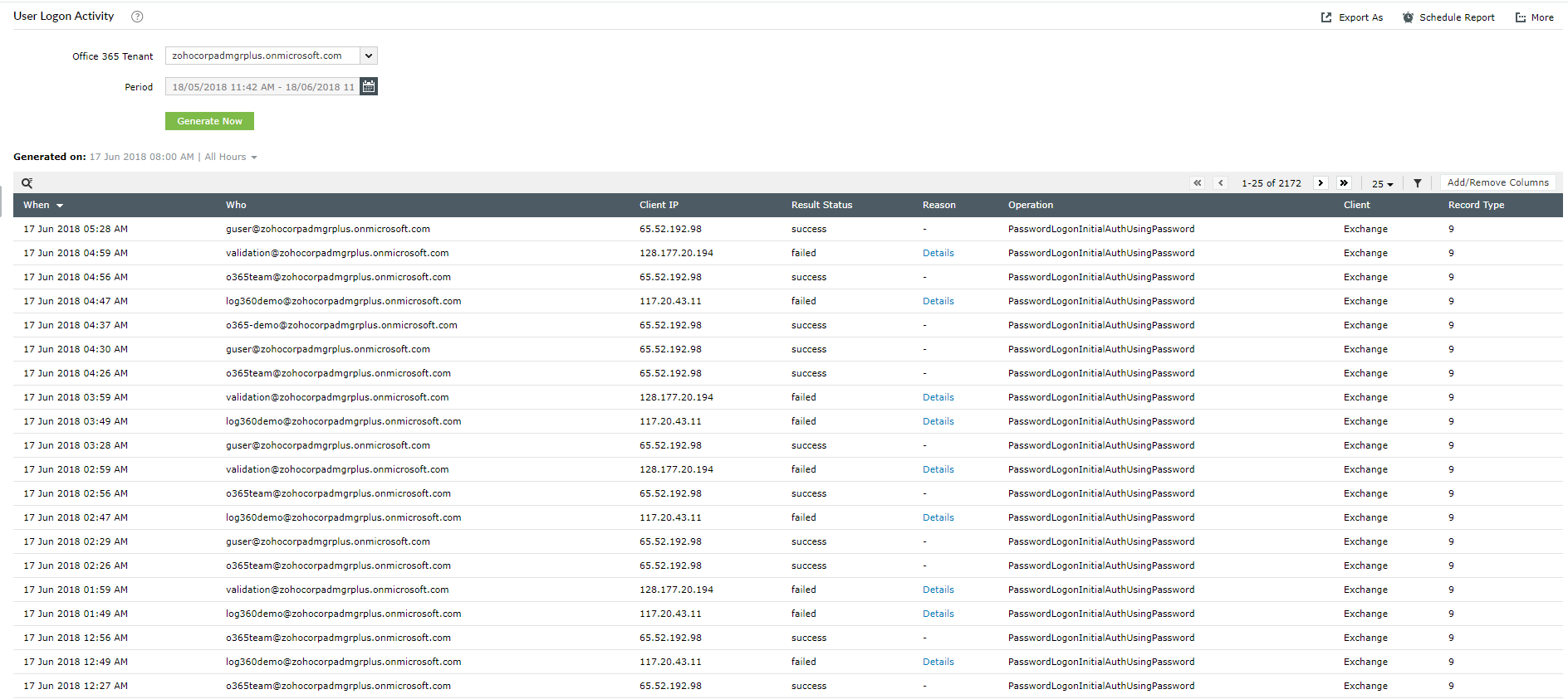 O365 Manager Plus offre i seguenti report di controllo sugli accessi utente: