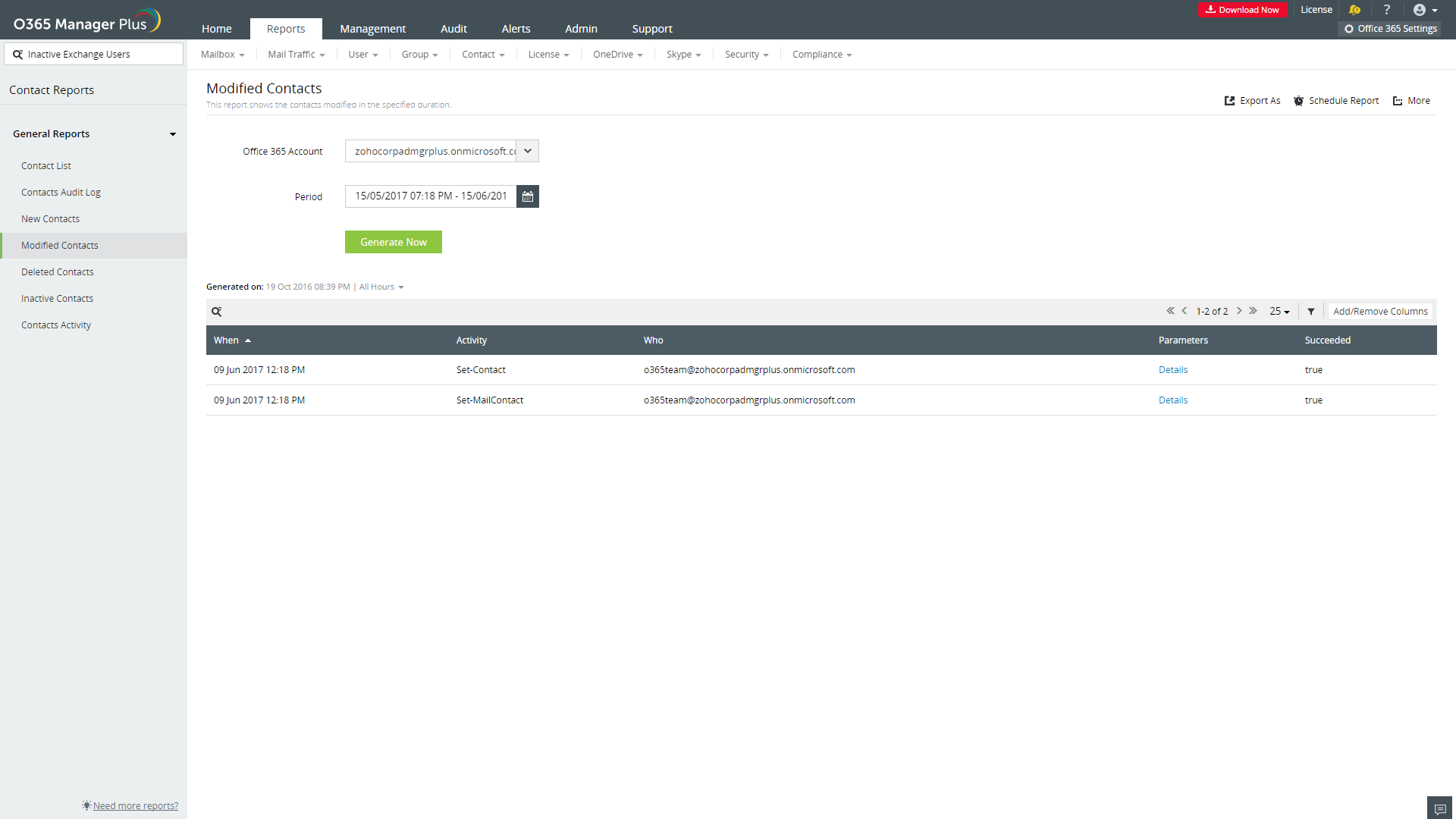 Ottieni dettagli preziosi su tutte le attività sugli oggetti contatto grazie ai report sui contatti di M365 Manager Plus e limita le attività degli utenti malintenzionati.