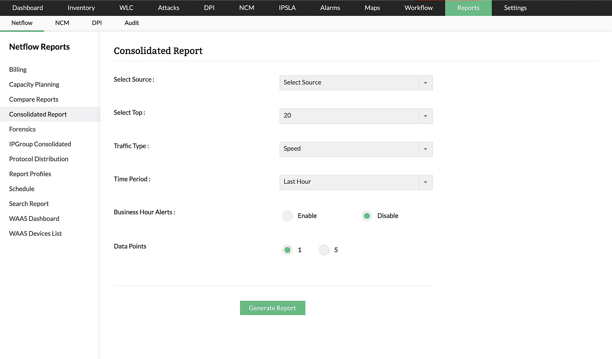 Oltre ai report consolidati, è possibile generare dati storici e prevedere il traffico futuro con i report di previsione, le tendenze del traffico utilizzando i report di pianificazione della capacità e apportare modifiche alle strategie di gestione della larghezza di banda utilizzando il componente aggiuntivo di gestione della configurazione di rete (NCM). Il nostro software di analisi del traffico di rete offre anche una visione end-to-end dell'utilizzo delle applicazioni e dei protocolli e altre tendenze di utilizzo.