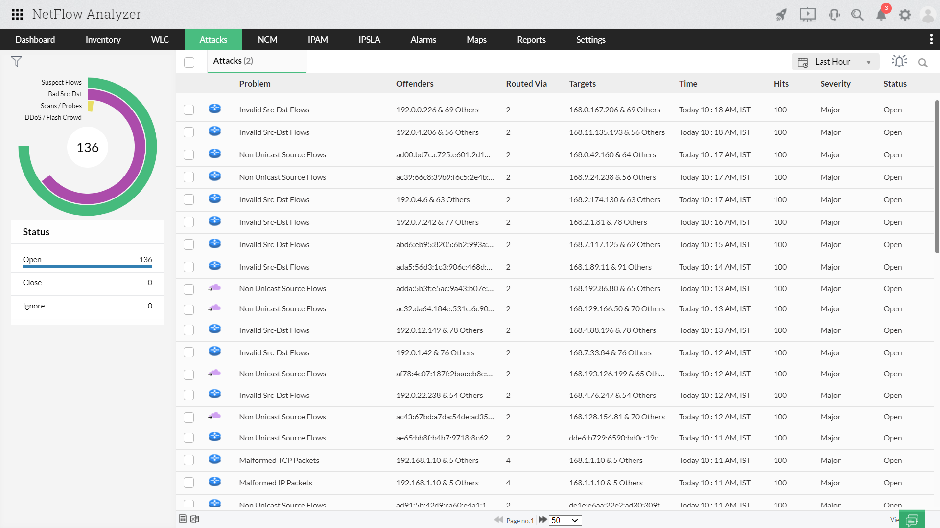 NetFlow Analyzer, lo strumento di analisi del traffico di rete ha un algoritmo predefinito che rileva qualsiasi attività sospetta e la raggruppa come attacco. È possibile analizzare il traffico di rete alla ricerca di comportamenti insoliti e verificare se l'attività è autentica o dannosa.