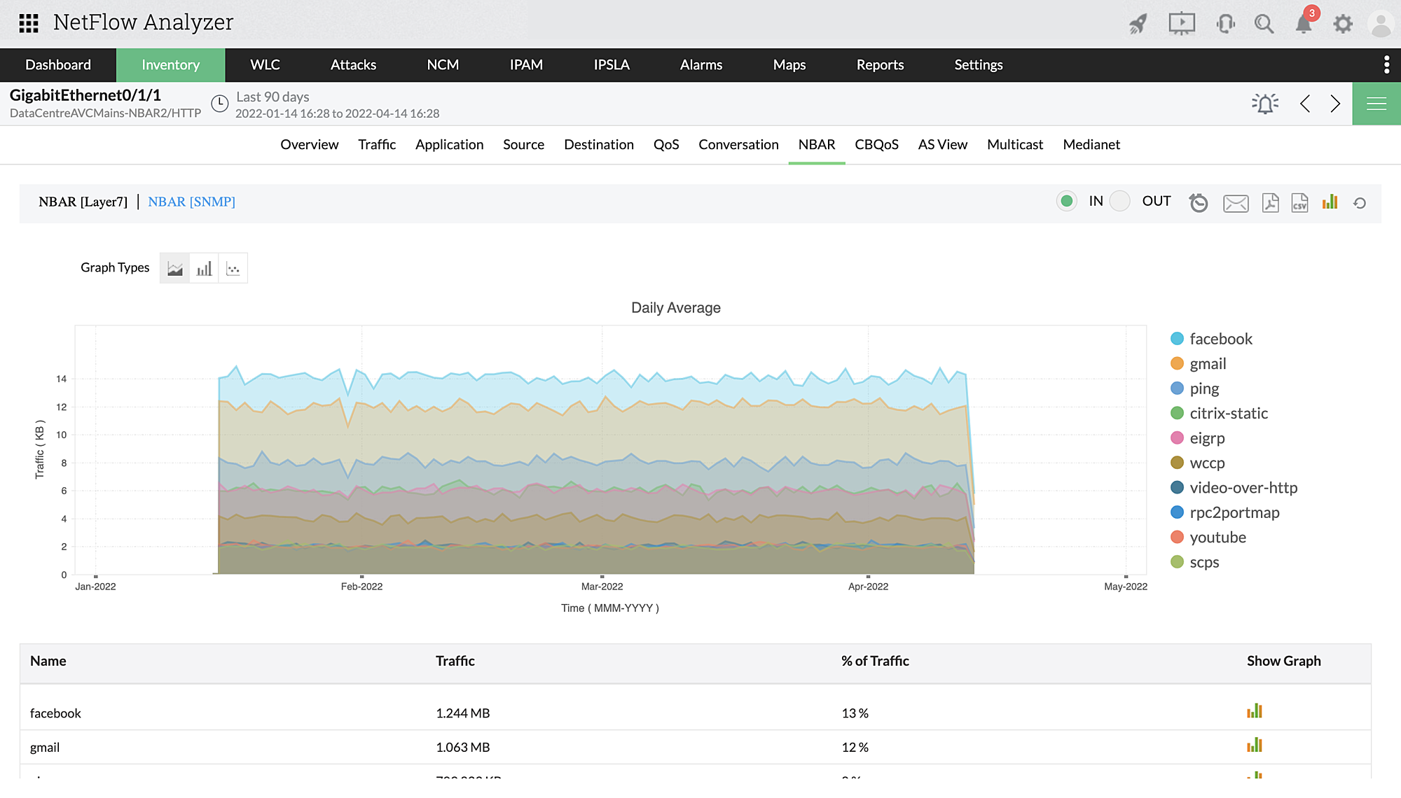 È possibile utilizzare il nostro strumento di analisi del traffico di rete (NTA) per monitorare il traffico consumato dalle applicazioni che utilizzano porte dinamiche. Con la tecnologia Cisco NBAR l'analisi del traffico può diventare più approfondita con approfondimenti sul traffico applicativo di livello 7. È possibile verificare la quantità di traffico consumata da applicazioni come Skype, Ping o Facebook, ecc. e ottimizzare l'uso della rete solo per le applicazioni business-critical.