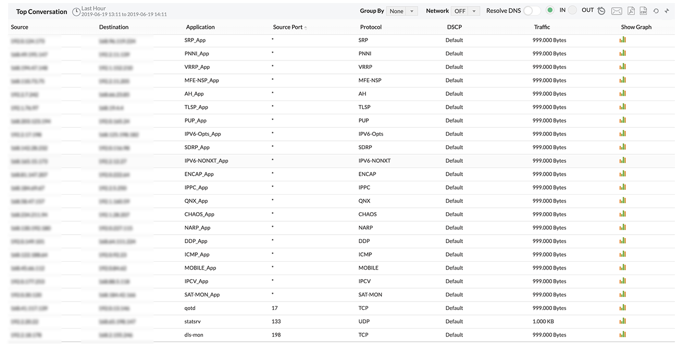 I report sulle conversazioni di questo strumento di monitoraggio del traffico in tempo reale consentono agli amministratori di rete di vedere gli IP di origine e di destinazione associati a ciascuna conversazione corrispondente a qualsiasi protocollo. Questo report aiuta il team IT a stabilire le priorità della larghezza di banda tra le applicazioni business critical e le applicazioni standard.