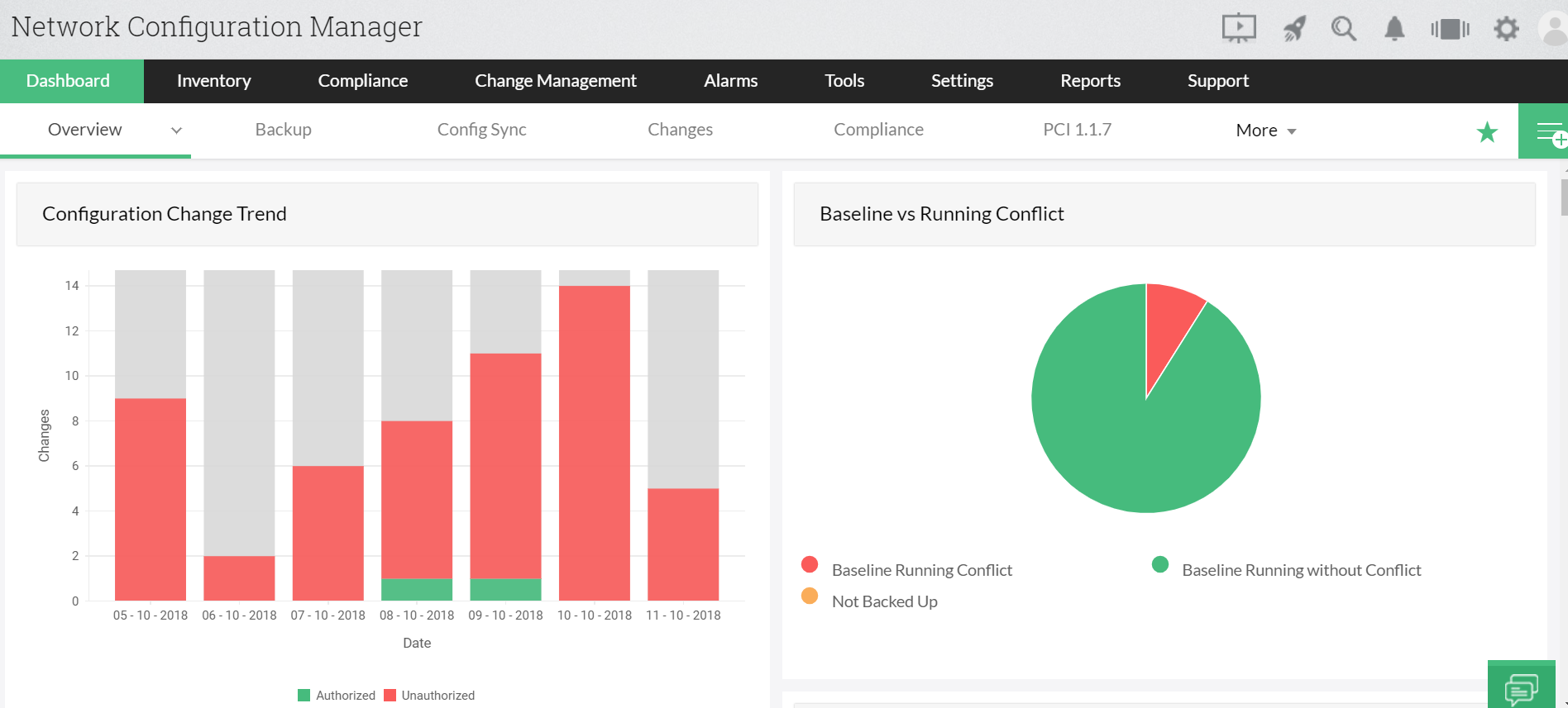Network Configuration Manager (NCM) è uno strumento completo di gestione della configurazione di rete che aiuta a gestire l'intero ciclo di vita dei dispositivi e delle configurazioni di rete. Offre soluzioni per la gestione della configurazione di rete, del cambiamento e della conformità. NCM ti assiste anche in operazioni di rete cruciali come l'automazione di operazioni di rete complesse, la programmazione di backup, il monitoraggio dell'attività degli utenti, la generazione di rapporti dettagliati e molto altro ancora.