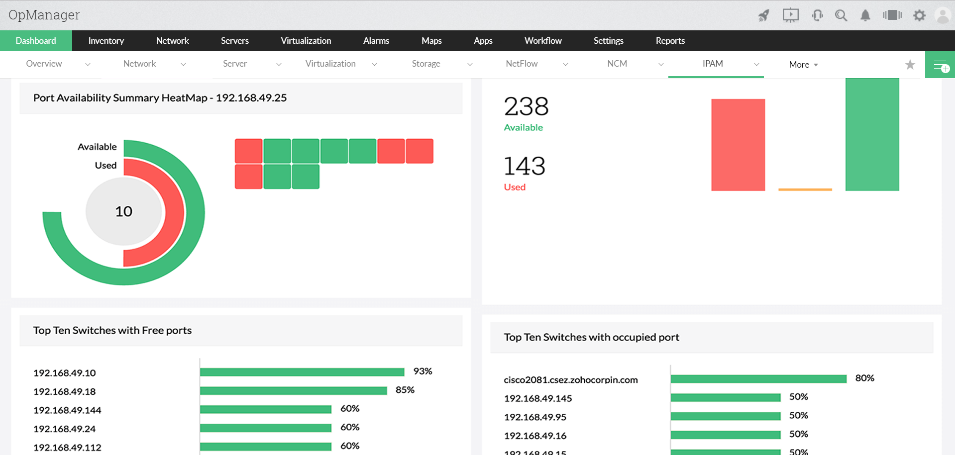 ManageEngine OpManager è un software completo per il monitoraggio degli switch di rete. Con OpManager è possibile monitorare la disponibilità, l'integrità e le prestazioni degli switch. La funzionalità di monitoraggio dell’interruttore di OpManager rileva automaticamente gli switch nella rete e li inserisce in una speciale mappa degli switch. Anche tutte le porte degli switch vengono scoperte e posizionate in modo intuitivo sulla mappa.