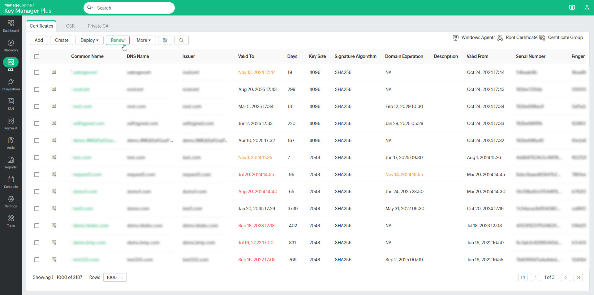 The Certificates tab in Key Manager Plus is a centralized console where all types of SSL certificates such as Self Signed, Root Signed, Microsoft CA Signed, certificates issued by third-party CAs etc., are consolidated and displayed. Through the Renew option, these certificate types can be renewed in the Certificates tab directly. These renewed certificates will automatically inherit the deployed servers and their credentials. For certificates issued by third-party CAs, the renewal will be initiated and redirected to the respective CA's tab. After successful renewal, the previous version of the certificate will be listed under Certificate History.