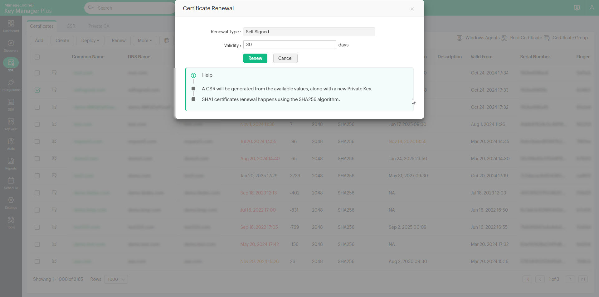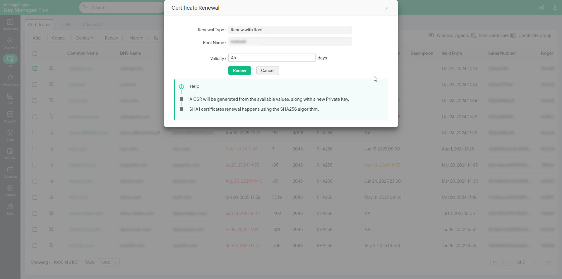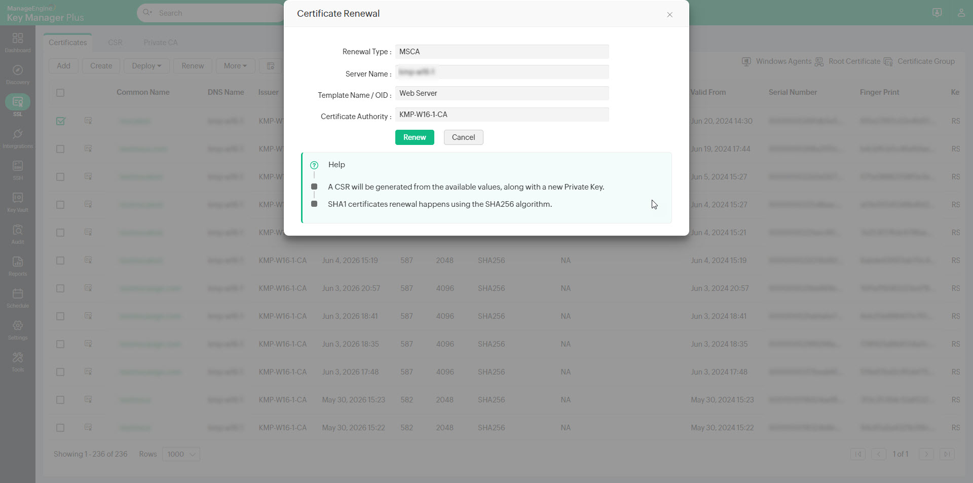 Certificates issued by Local CA can be renewed automatically from Key Manager Plus.