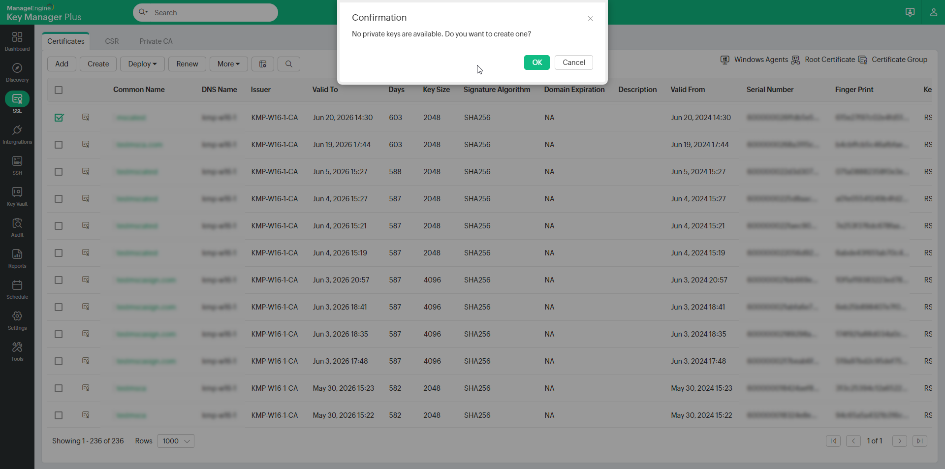 - If the certificate does not have a private key, Key Manager Plus allows you to create a new private key. Click OK in the pop-up that appears.
