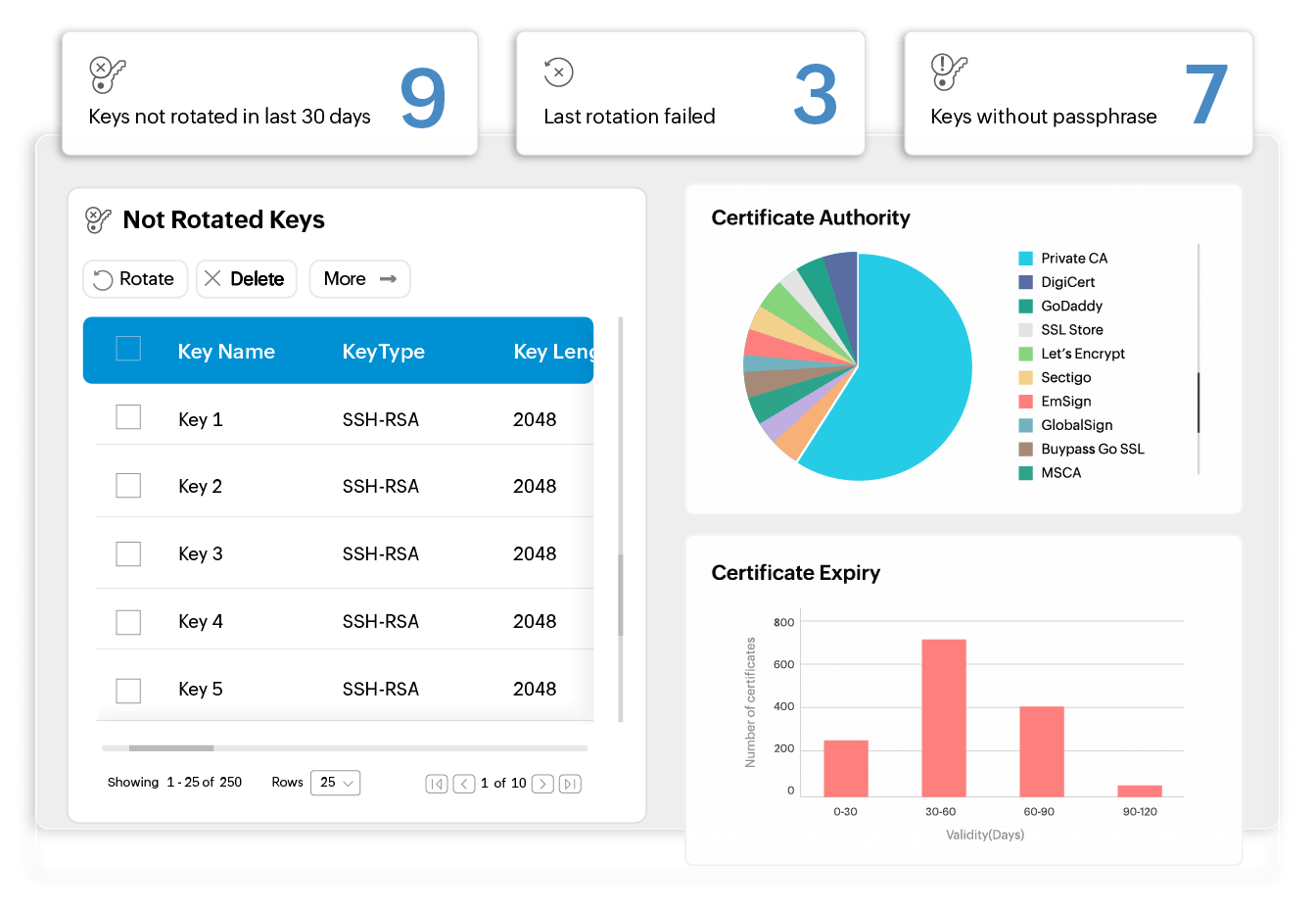 Stay ahead of security risks with proactive monitoring of SSH keys. Key Manager Plus has dedicated dashboard widgets to inform you about keys that have not been rotated for a long time. It also allows you to configure the maximum number of days for a key to remain unrotated, after which you will be promptly notified.