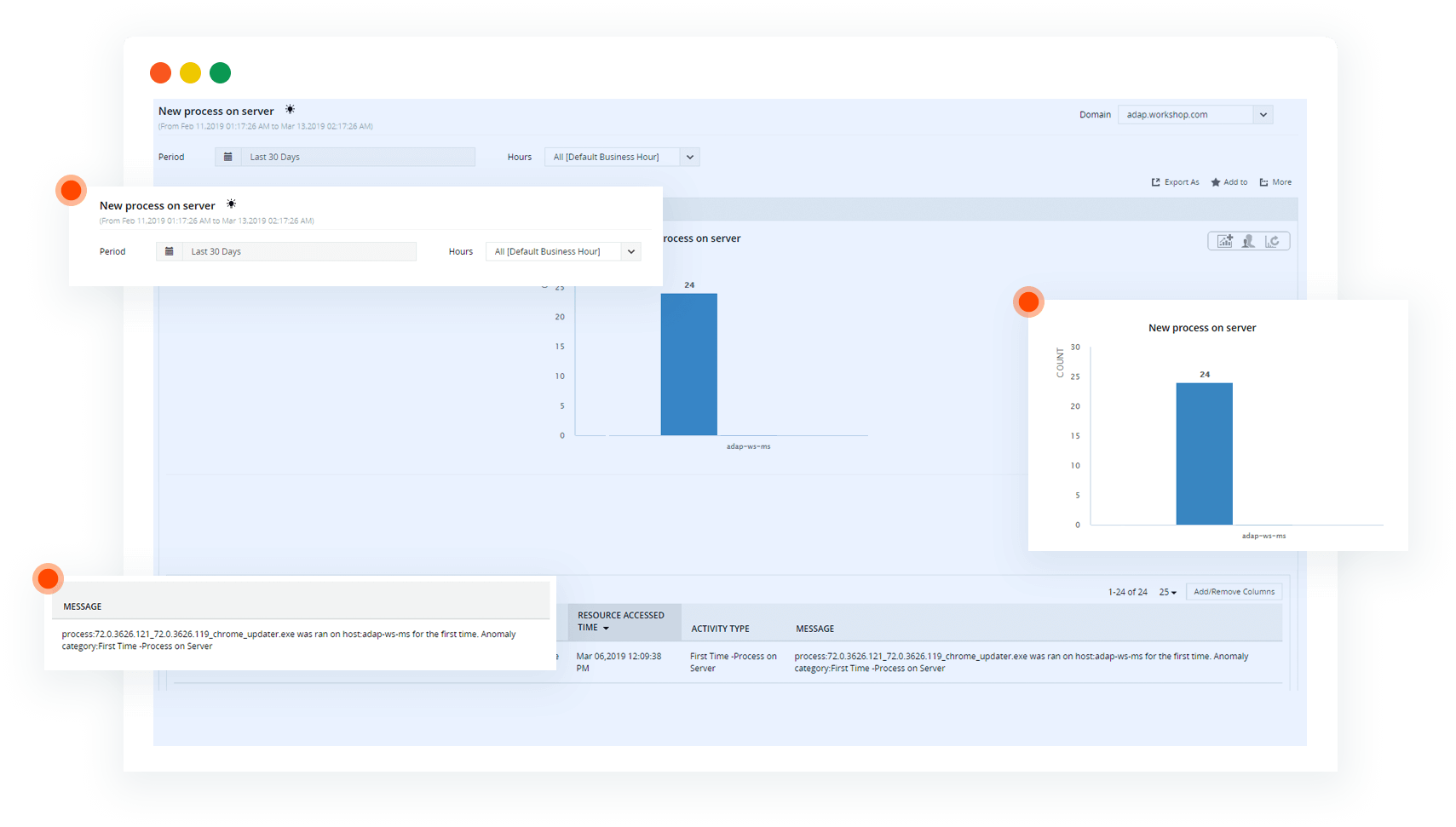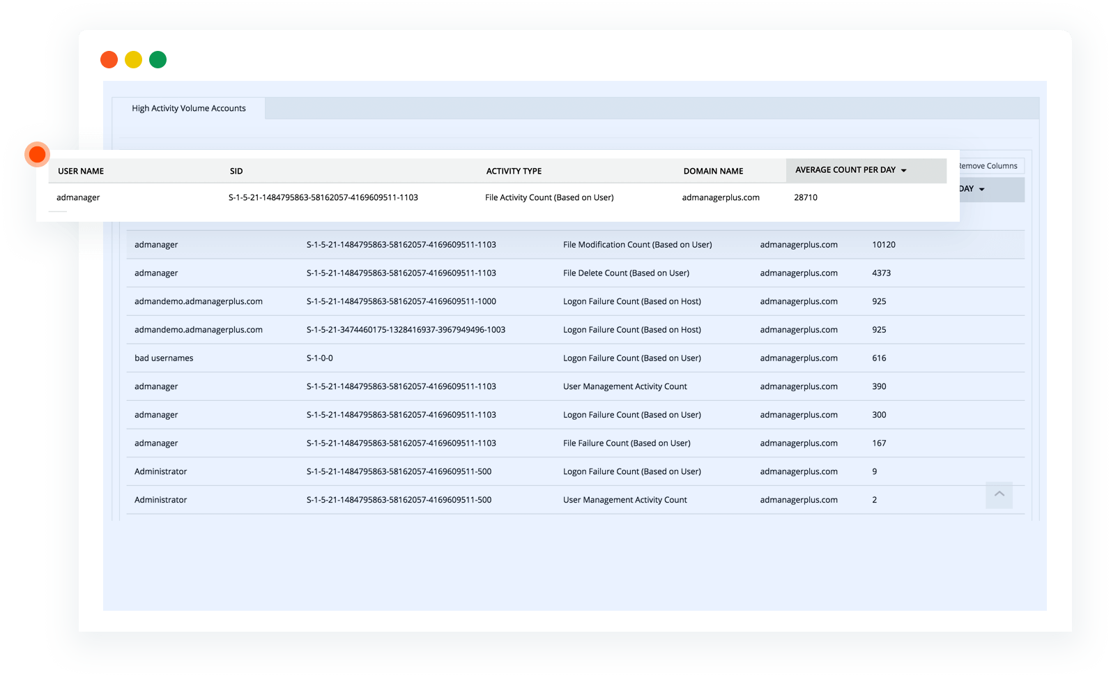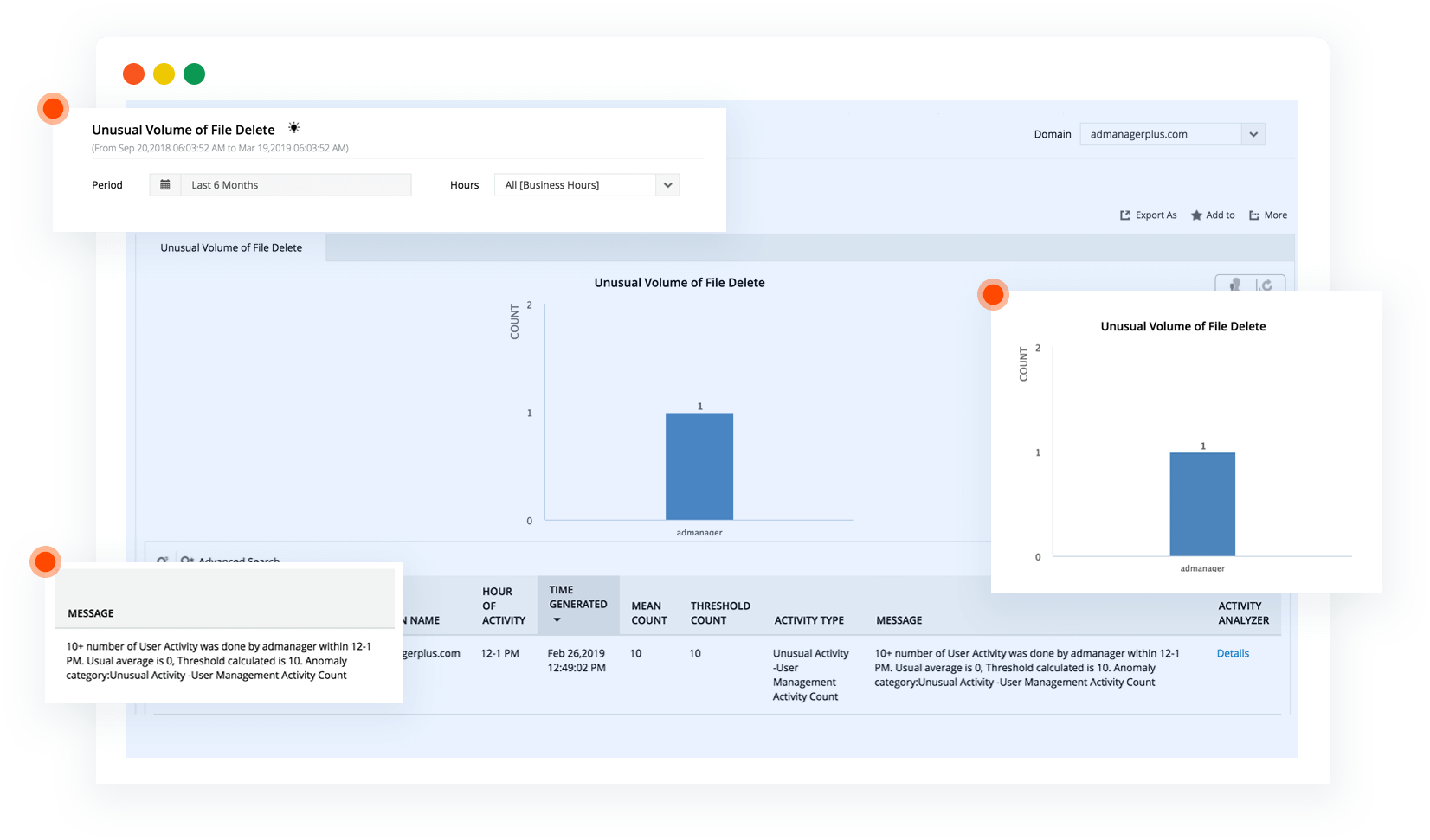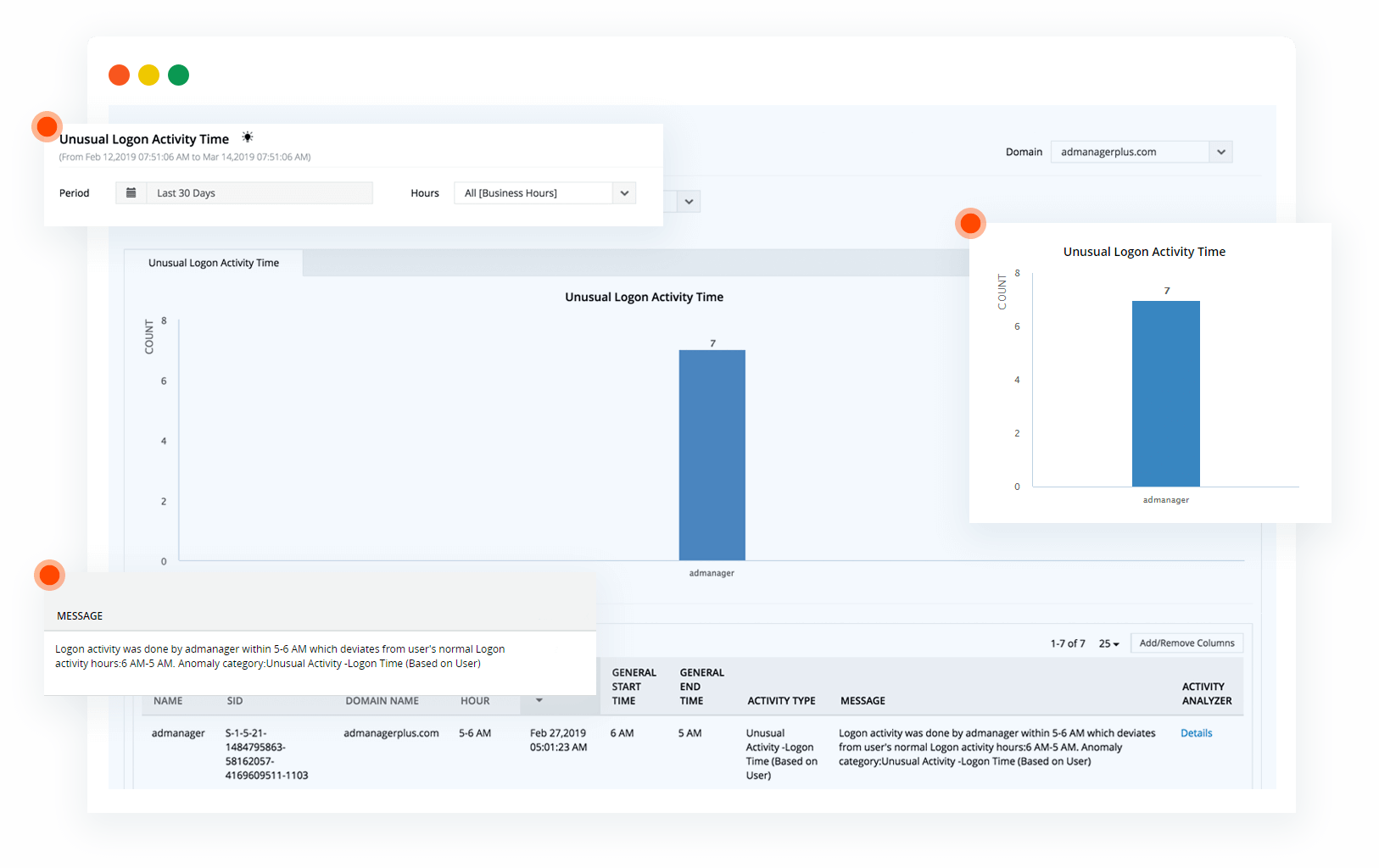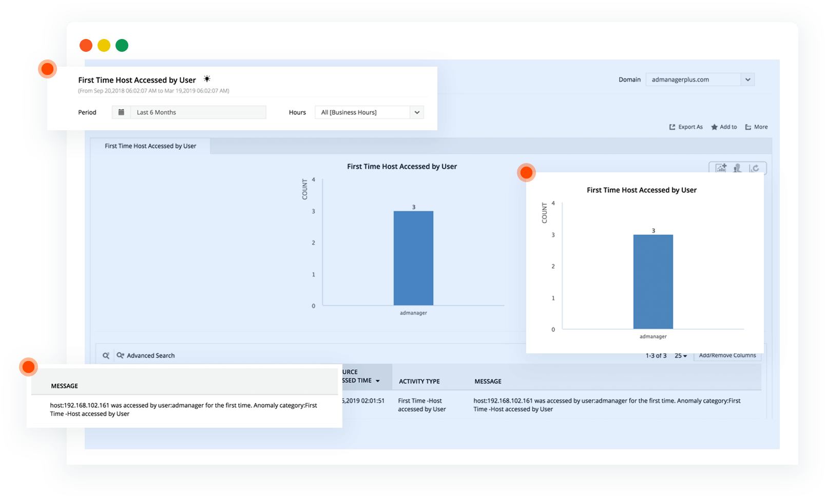 Por ejemplo, un usuario que accede de forma consistente a un servidor crítico fuera de las horas laborales no provocaría una alerta falsa debido a que es un comportamiento típico de dicho usuario. Por otro lado, ADAudit Plus enviaría una alerta instantánea si ese mismo usuario accede a dicho servidor durante un momento en que nunca ha accedido antes, incluso si el momento de ese acceso particular está dentro de las horas comerciales.