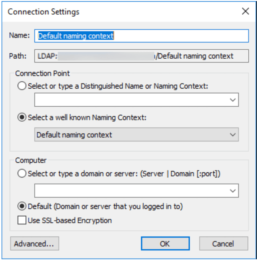 - En la nueva ventana, asegúrese de que Nombre se establece en Contexto de nomenclatura predeterminado y el nombre de dominio mencionado en la Ruta de acceso es el dominio que desea auditar.