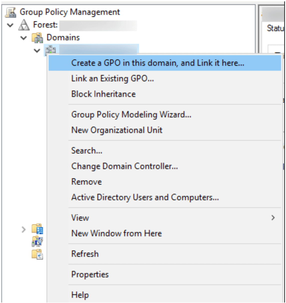 - Haga clic con el botón derecho en el dominio o unidad organizativa (OU) que desea auditar y haga clic en Crear una GPO en este dominio y vincúlela aquí.