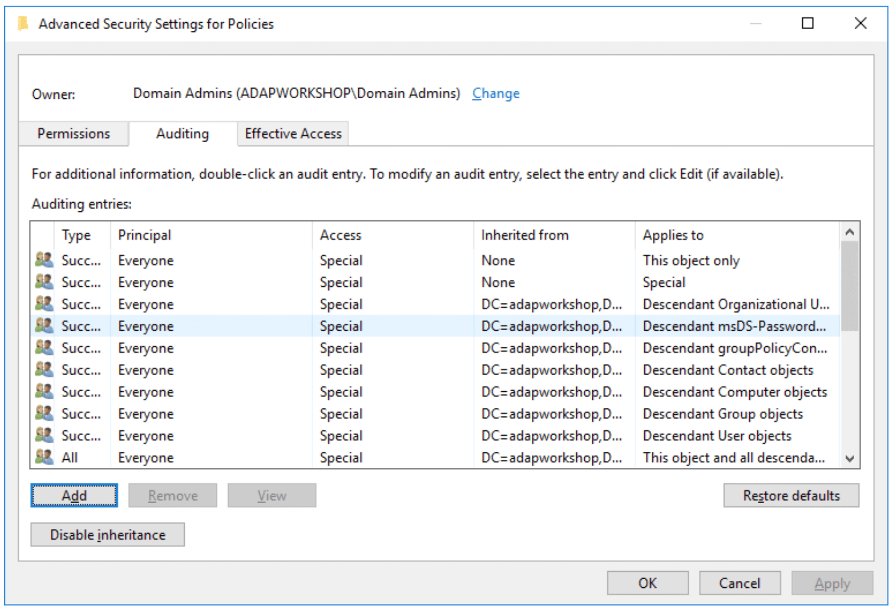 Ahora ha habilitado la auditoría de la creación y eliminación de objetos groupPolicyContainer.