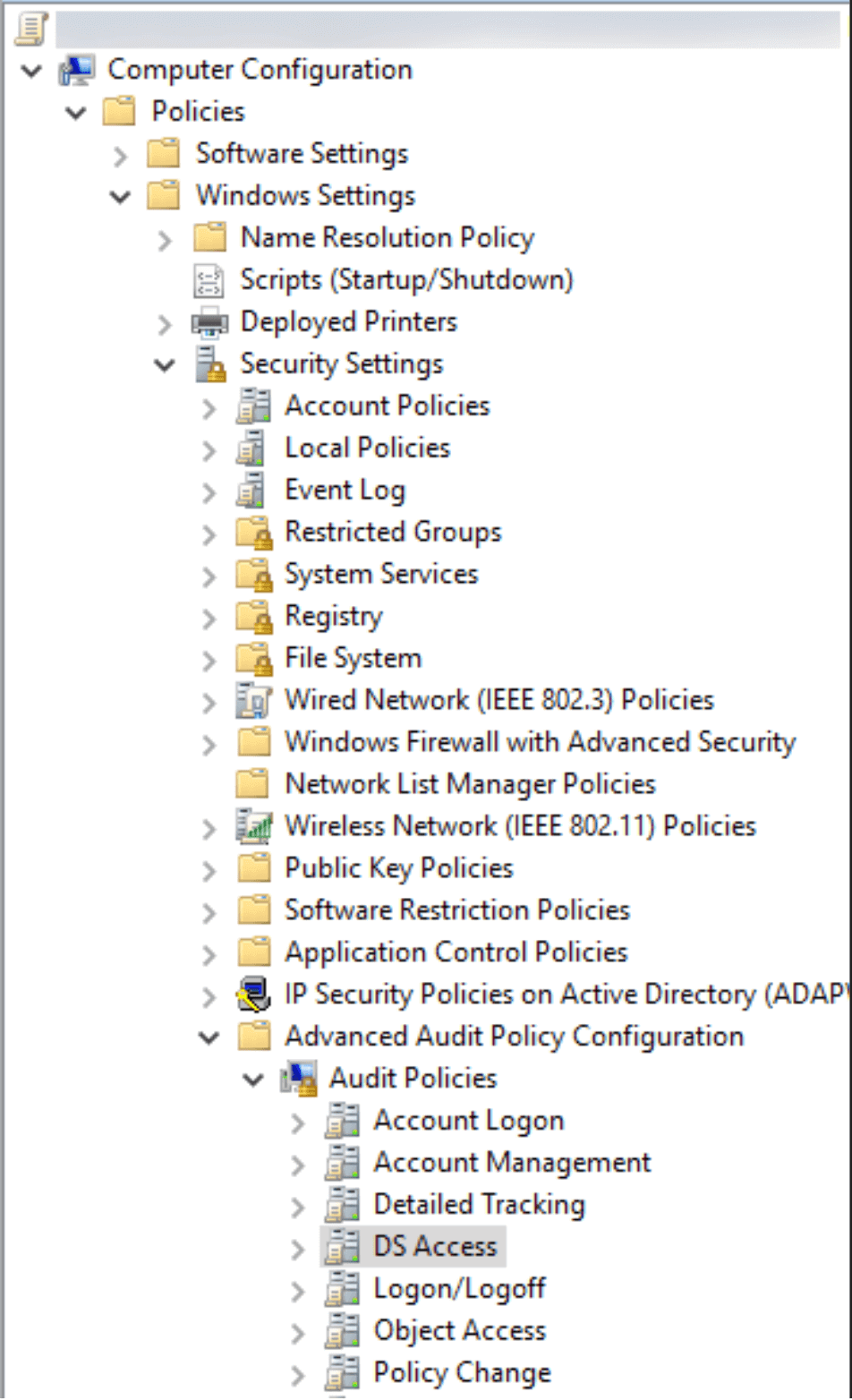 - En el Editor de administración de directivas de grupo, en el panel izquierdo, vaya a Configuración del equipo > Directivas > Configuración de Windows > Configuración de seguridad > Configuración de directiva de auditoría avanzada > Directiva de auditoría > Acesso DS.