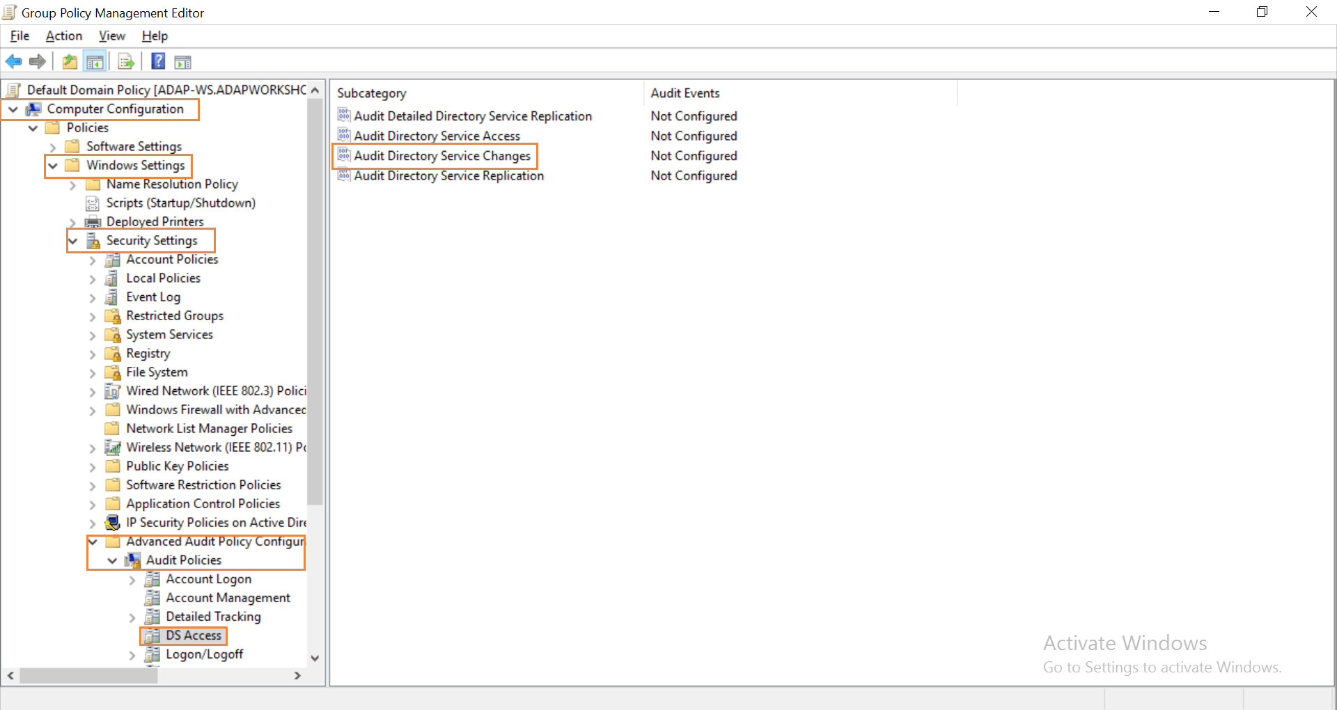 Expanda el nodo y haga clic en Acceso DS y, a continuación, configure Auditar cambios de servicio de directorio. Habilítelo tanto para Éxito como para Error.