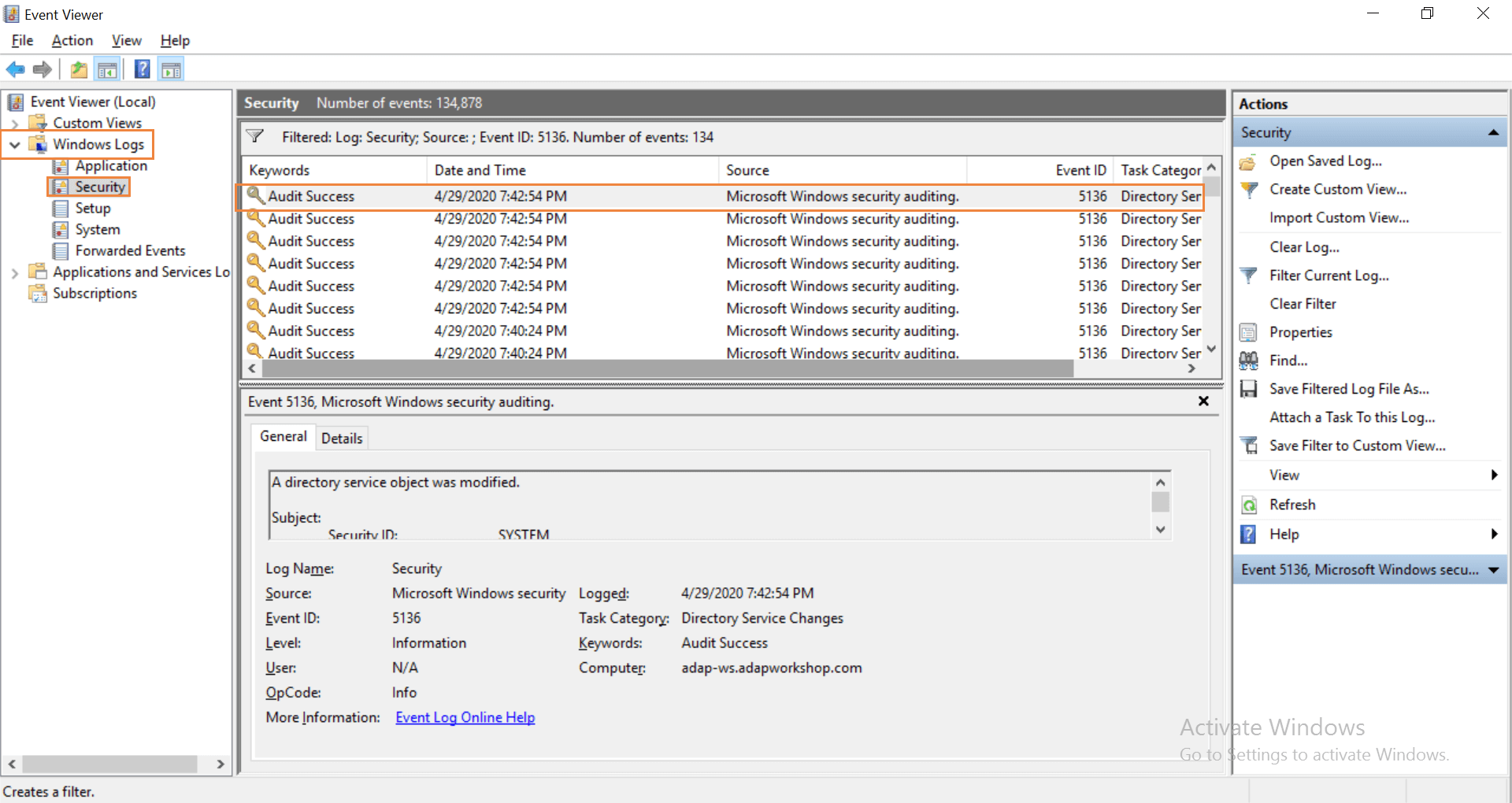 Para ver o acceder a los registros de eventos, abra el Visor de eventos y haga clic en Registros de Windows en el panel izquierdo. A continuación, seleccione la opción Seguridad para ver los registros de eventos relevantes en el panel central. Busque el ID de evento 5136 que se activa cuando se modifica un objeto de directorio.