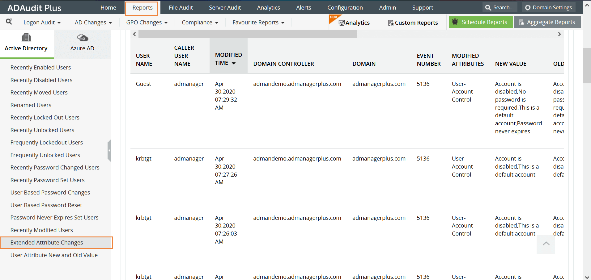 Abra la consola ADAudit Plus y haga clic en la pestaña Reports. Escoger User Management y vaya hasta el informe de Extended Attribute Changes. Se trata de un informe exhaustivo que proporciona toda la información necesaria en un solo lugar. A continuación se muestra un informe de ejemplo: