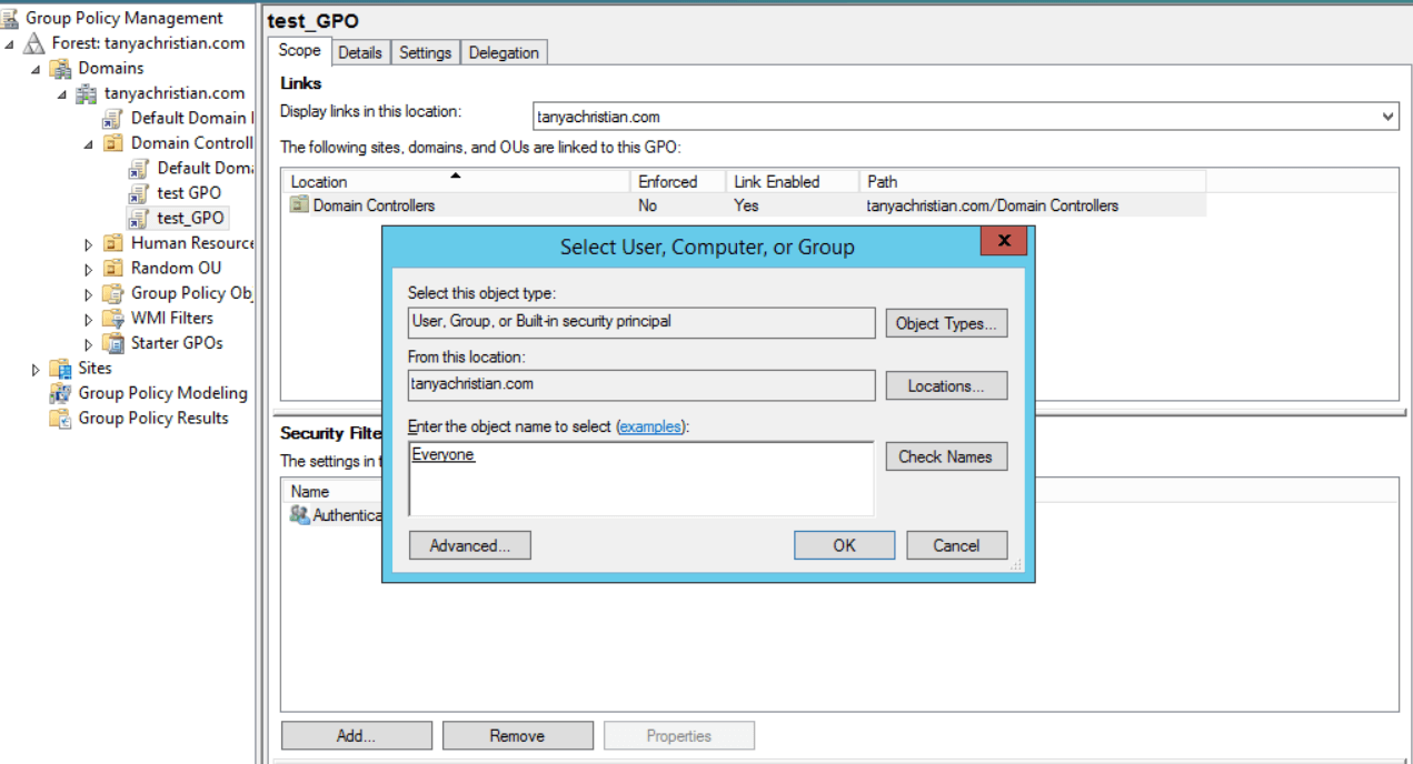 - Vaya al nodo 'Controladores de dominio' y seleccione la GPO recién modificada. De acuerdo con la pestaña 'Ámbito' en el panel derecho, encontrará la sección 'Filtrado de seguridad'. Seleccione 'Agregar'.