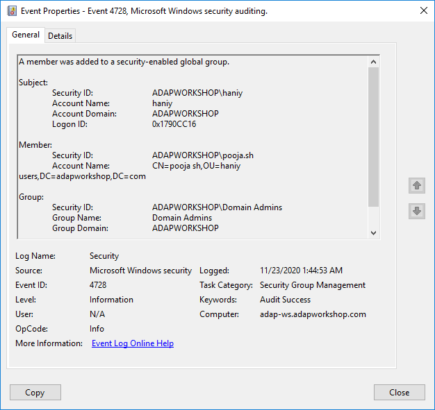 Supervise de forma diferenciada todos los eventos de AD y vea quién ha agregado al usuario al grupo Administrador del dominio junto con los detalles sobre cuándo y dónde.