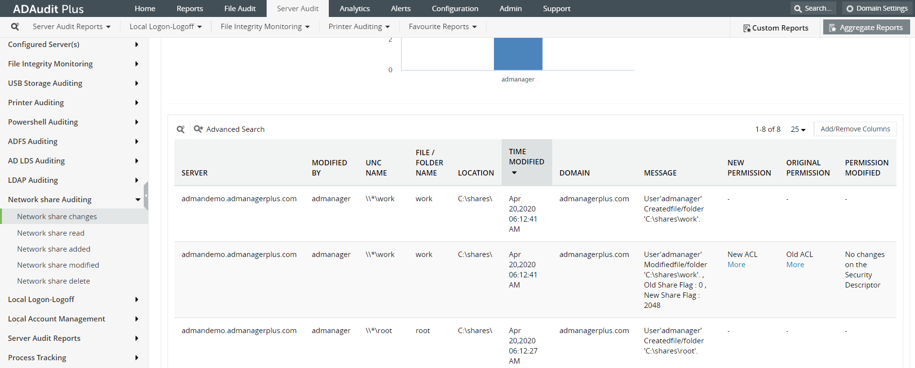 PowerShell nativo ofrece poco en cuanto a la administración de NTFS. Para ver los permisos NTFS en PowerShell, deberá descargar el módulo NTFSSecurity desarrollado por Microsoft. Esto requiere una configuración previa antes de poder ejecutar el módulo. El módulo NTFSSecurity lo equipa con la capacidad de administrar permisos NTFS a través de PowerShell, sin embargo, si prioriza tener una interfaz más simple para hacer esto, puede probar ADAudit Plus. La sencilla interfaz de usuario no requiere mucho tiempo de configuración y puede ver los permisos NTFS fácilmente desde el panel de control. El panel de control también le permite gestionar fácilmente los permisos de archivos para los servidores de archivos de NetApp, EMC y Windows.