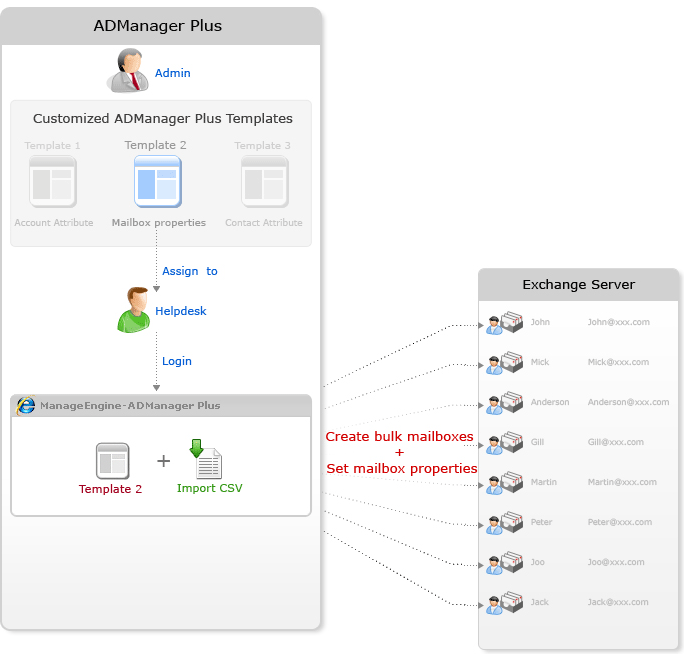En la situación anterior, el administrador de TI, debido a la enorme cantidad de sus responsabilidades en la gestión de Active Directory, decide delegar algunas de sus tareas de gestión de Exchange a las mesas de ayuda de la organización. Pero también quiere tener control completo sobre todas estas tareas y garantizar que se realizan de forma eficiente y segura. Para lograr esto, él utiliza las plantillas personalizadas que ADManager Plus proporciona, las configura con las propiedades que el buzón del usuario necesita y luego la asigna a uno de los técnicos de la mesa de ayuda (puede incluso ser un empleado sin experiencia en la organización). El técnico de la mesa de ayuda inicia sesión en ADManager Plus, solo importa un archivo CSV con los atributos de usuario necesarios y aplica la plantilla asignada. Así, se ha creado una gran cantidad de buzones de Exchange y se han ajustado sus propiedades de buzón en un parpadeo, ¡todo sin modificar o elevar los derechos de la mesa de ayuda en Active Directory o Exchange Server! ¡De esta forma, usted convierte a un novato que no es de TI en un administrador de Exchange!