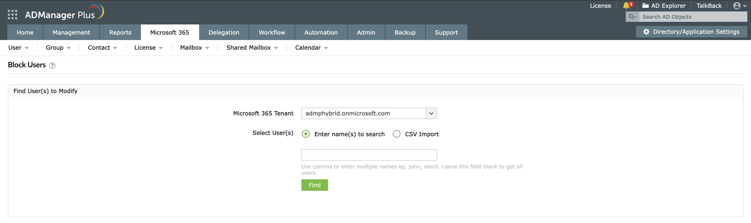 ADManager Plus , la solución web de gestión e informes de Active Directory (AD), también se funciona como una plataforma de gestión e informes de Office 365. También le permite aprovisionar o desaprovisionar usuarios de AD y Office 365 simultáneamente, modificar atributos de varios usuarios y bloquear, desbloquear o eliminar usuarios de Office 365 con solo unos pocos clics.