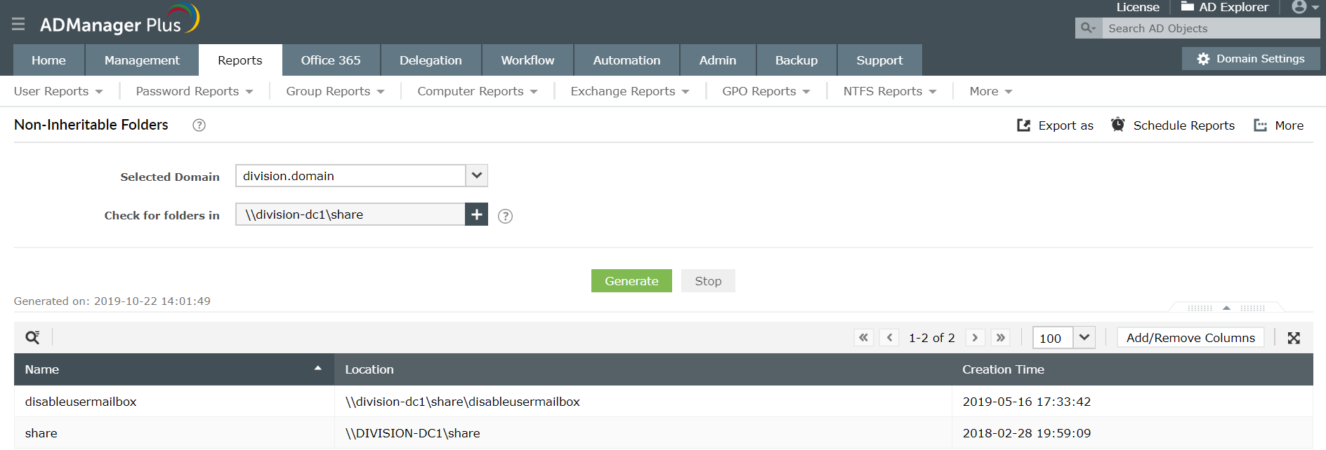 - Informe de carpetas no heredables: Enumere las carpetas y los archivos protegidos de los permisos heredables. Especifique la ruta para generar una lista de todos los archivos y carpetas que tienen restringido heredar los permisos de sus objetos primarios.