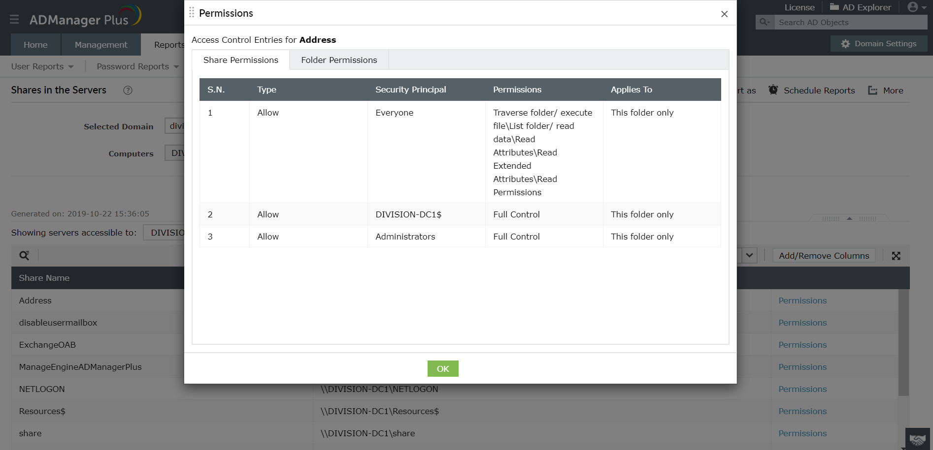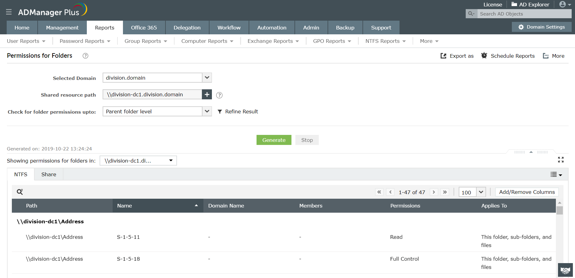 - Inicie sesión en ADManager Plus y acceder al informe de Permisos para carpetas.