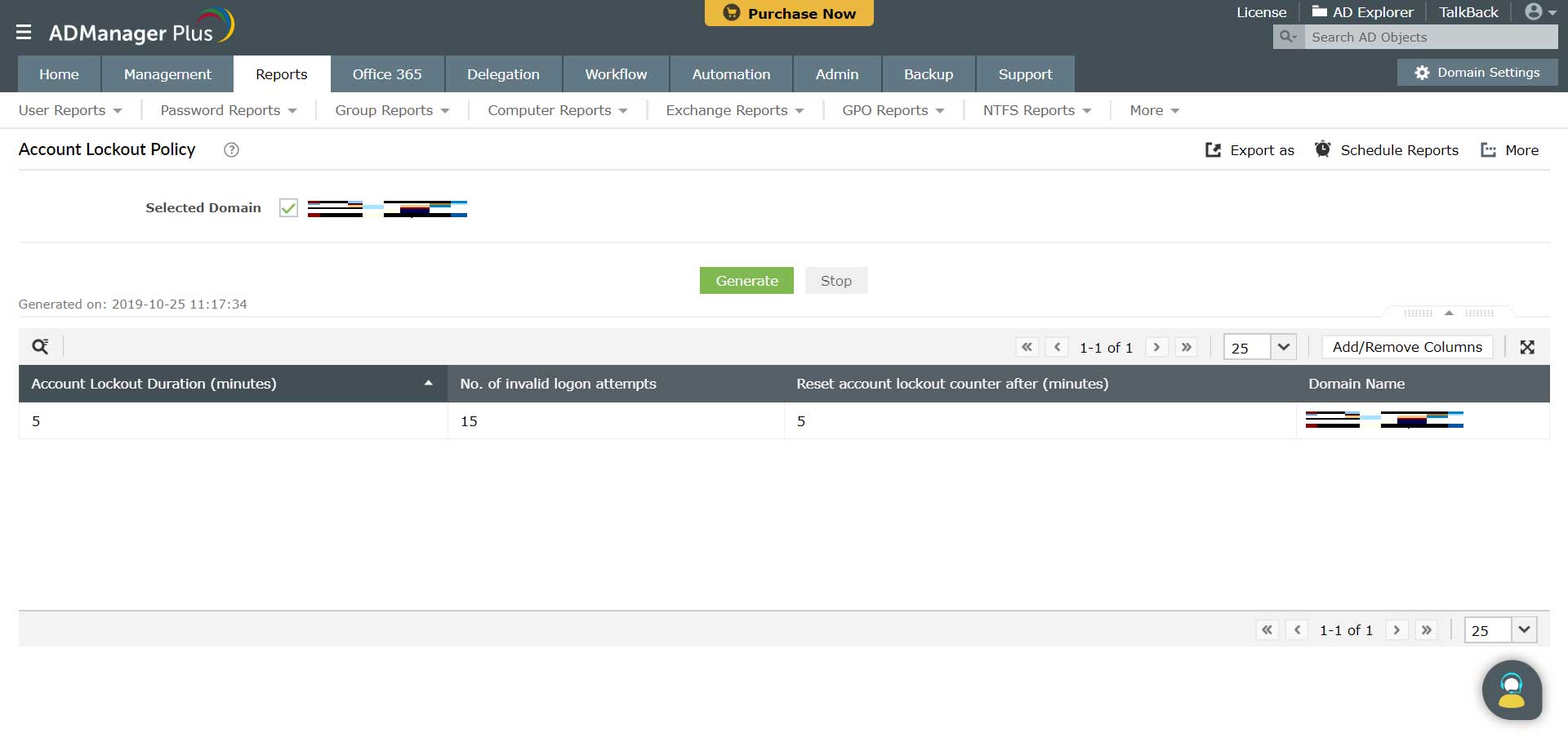 Informe para ver los detalles de las políticas de bloqueo de cuentas, como la Duración del bloqueo, Umbral de bloqueo y otros, de los dominios seleccionados.