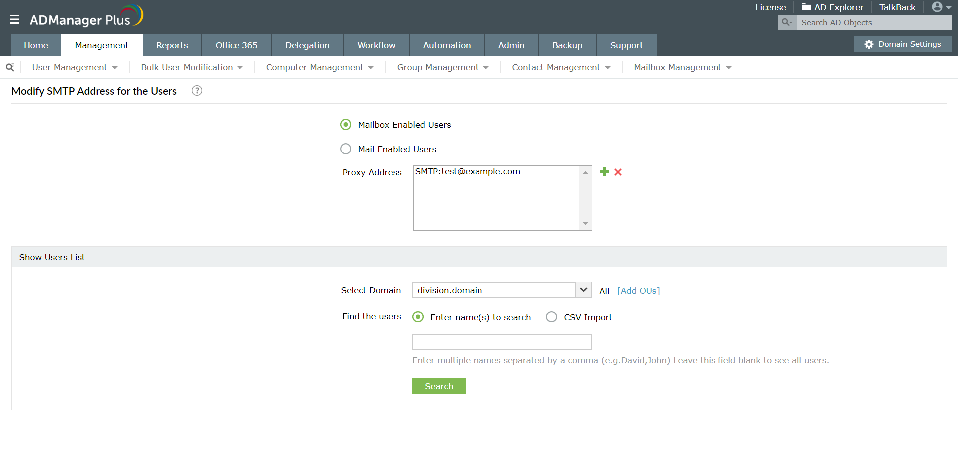 ADManager Plus le permite realizar lo mismo con unos pocos clics desde su consola GUI basada en la web. También tiene opciones para agregar múltiples direcciones proxy simultáneamente con plantillas y por Importación de un archivo CSV que contiene las direcciones proxy de los usuarios.