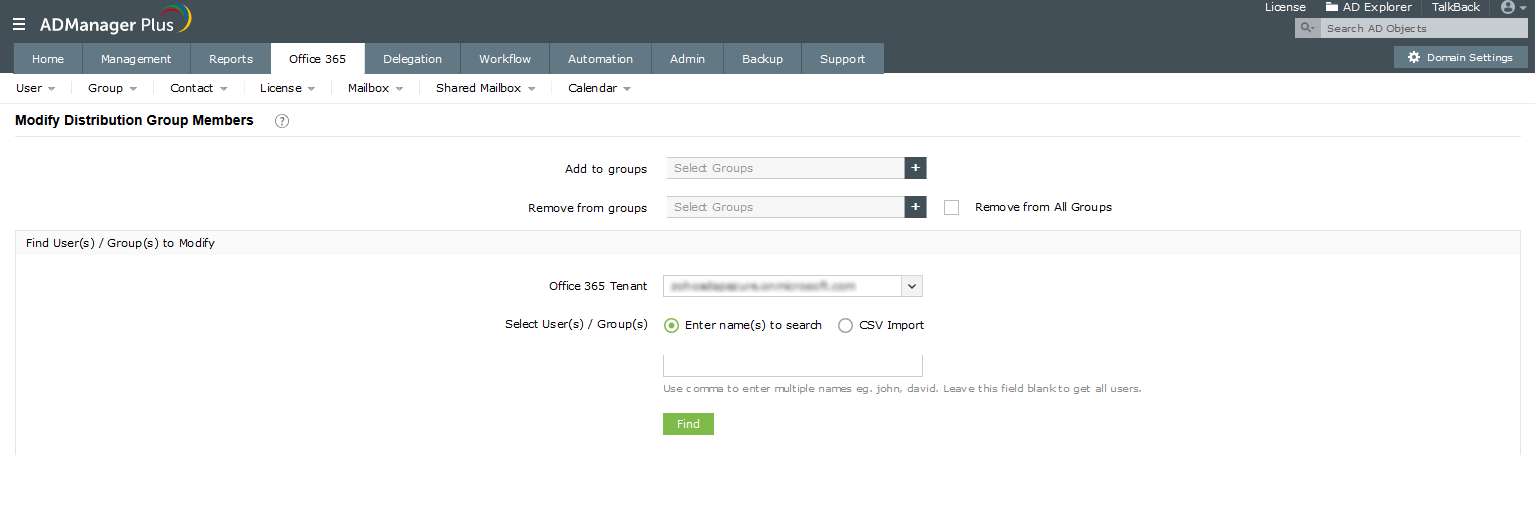 - Seleccione la opción Modify Distribution Groups de la pestaña Group Management in Office 365.