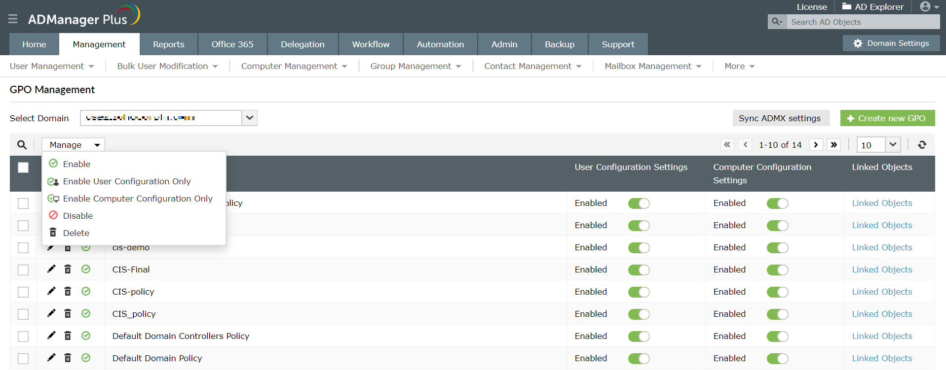 Mientras que los cmdlets de PowerShell que deben usarse para este propósito, New-GPLink y Remove-GPLink, hacen necesario el uso de múltiples parámetros para agregar o eliminar el enlace de una unidad organizativa, sitio o dominio, ADManager Plus le permite hacerlo con acciones puramente basadas en GUI, lo que lo convierte en la opción más fácil entre las dos.