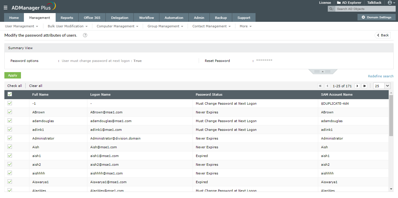 Administre la configuración de contraseñas de los usuarios de AD con informes de contraseñas específicos.