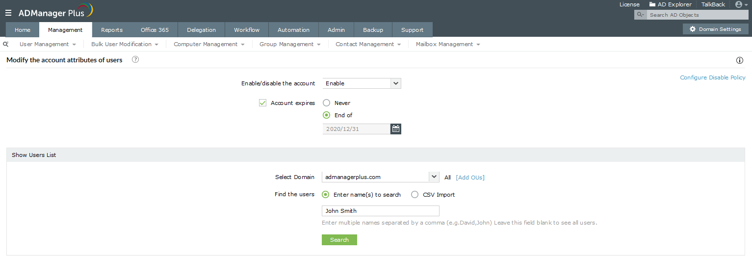 - Si desea habilitar cuentas AD de forma masiva o utilizar un archivo CSV para habilitar varias cuentas AD mediante PowerShell, deberá modificar el script. Sin embargo, con ADManager Plus, como la opción de importar CSV está integrada, puede usar la función de habilitar usuarios para habilitar solo una cuenta o varias cuentas a la vez.
