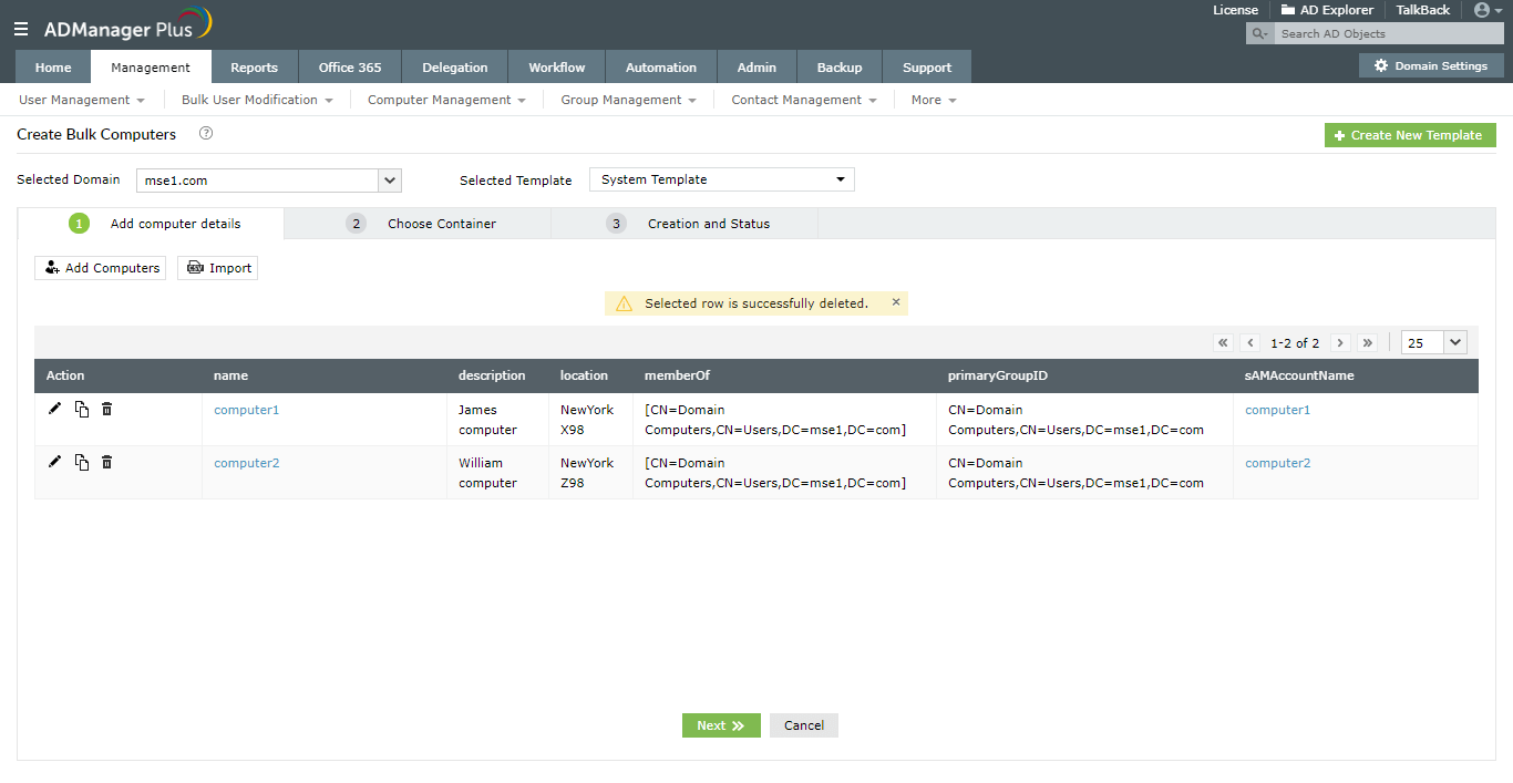 ADManager Plus puede crear equipos de forma masiva armado con solo un archivo CSV desde una interfaz de usuario simple e intuitivamente diseñada.