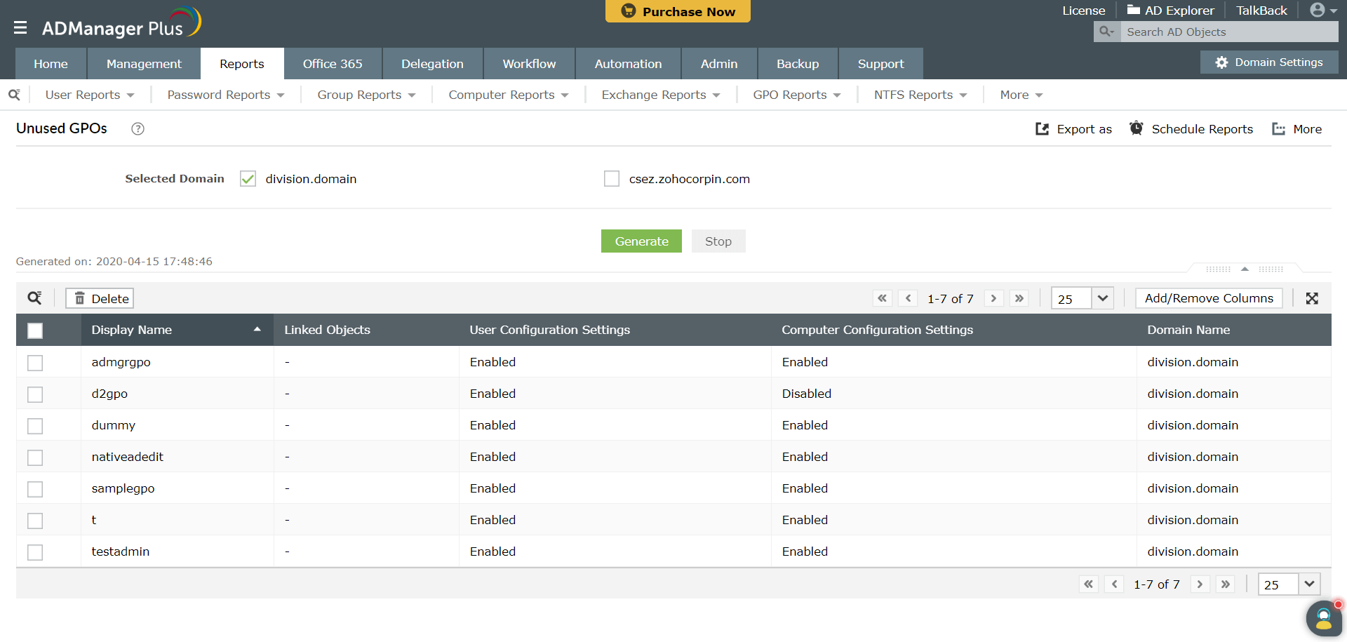 ADManager Plus le permite ver los GPO desvinculados con unos pocos clics desde su consola GUI basada en web. También tiene opciones para programar y enviar automáticamente los informes por correo electrónico. Más información al respecto aquí.