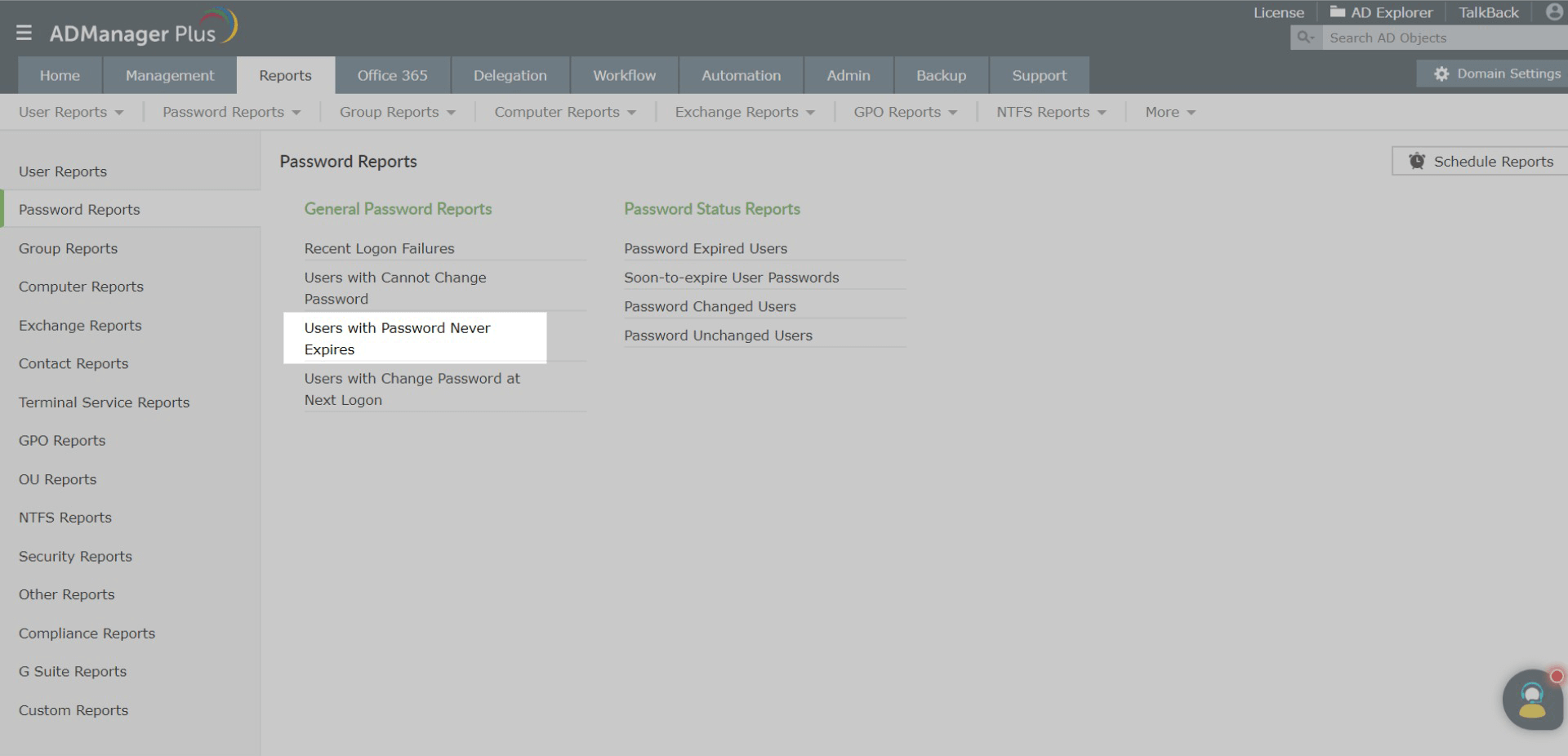 Este artículo compara el proceso de obtención de contraseñas que nunca caducan entre los usuarios que utilizan PowerShell y ADManager Plus, una herramienta de administración e informes de AD, Office 365 y Exchange completamente basada en GUI. Ofrece informes predefinidos para cada propósito, incluida la obtención de todas las cuentas de usuario con la contraseña nunca caduca establecida para ellas, lo que la convierte en la opción más fácil entre las dos.