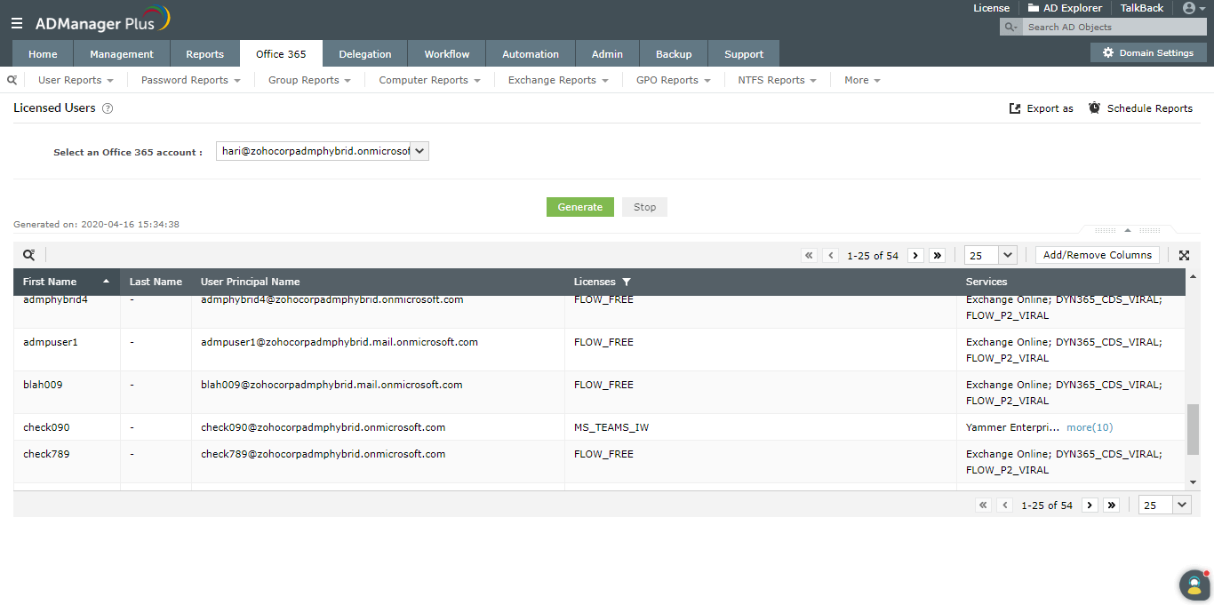 ADManager Plus puede recuperar informes de usuarios con licencia de Office 365 en formato CSV, PDF, HTML o XLSX en una interfaz de usuario sencilla y de diseño intuitivo.
