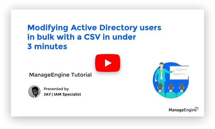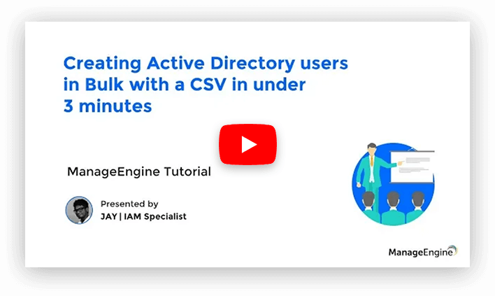 Video tip #1: Learn how to provision users across Active Directory, Office 365, and Google Workspace instantly using a CSV file. You can also learn how to schedule template-based automatic bulk user provisioning using data from a CSV file; databases such as MS SQL or Oracle Database; or HR management systems such as Workday or Zoho People.