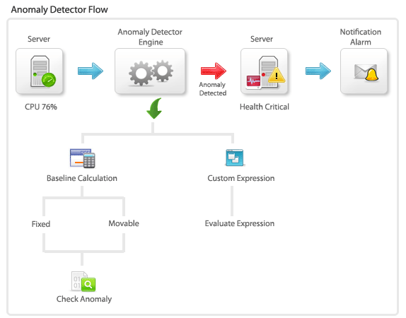 La anomalía se detecta cuando los datos actuales no se ajustan a las reglas definidas por el usuario [basadas en las variables del sistema]. Por ejemplo, el usuario puede crear una regla como Anomalía, la cual debe ser detectada cuando el Valor Medio de la Última Hora actual es mayor que el doble del Valor Medio Móvil de Seis Horas. Las alarmas críticas y de advertencia pueden ajustarse en consecuencia.