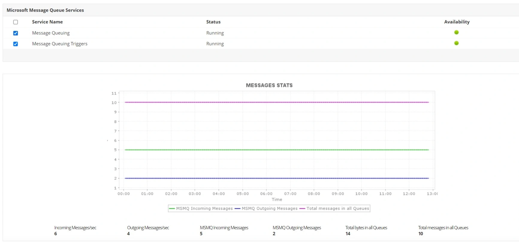 Cualquier interrupción o degradación del rendimiento de MSMQ puede provocar problemas como la pérdida de mensajes dentro de la empresa, la falta de comunicación entre servicios, etc. ManageEngine Applications Manager comprueba activamente los distintos contadores de rendimiento clave de MSMQ para comprobar si las colas están funcionando bien. El monitoreo de MSMQ incluye la gestión integral de fallos y las notificaciones de alarmas proactivas, la comprobación de problemas inminentes, la activación de acciones adecuadas y la recopilación de datos de rendimiento para planificar, analizar y elaborar informes.