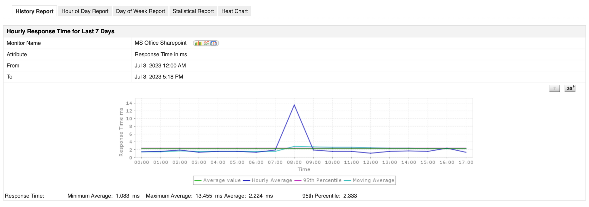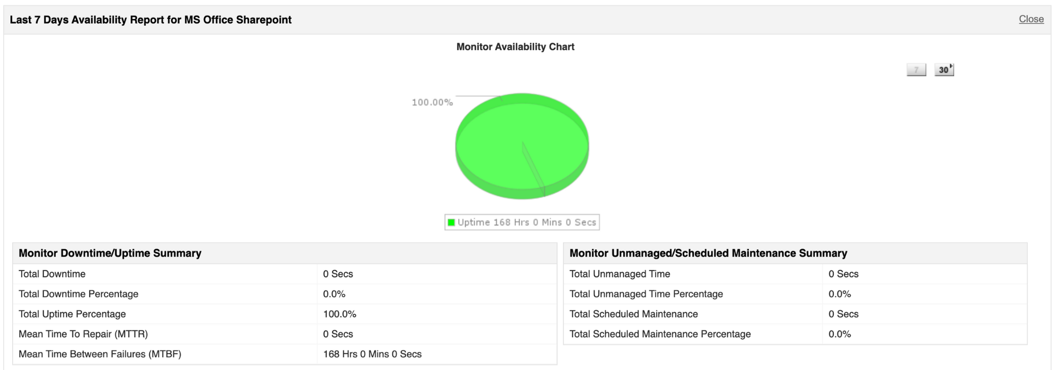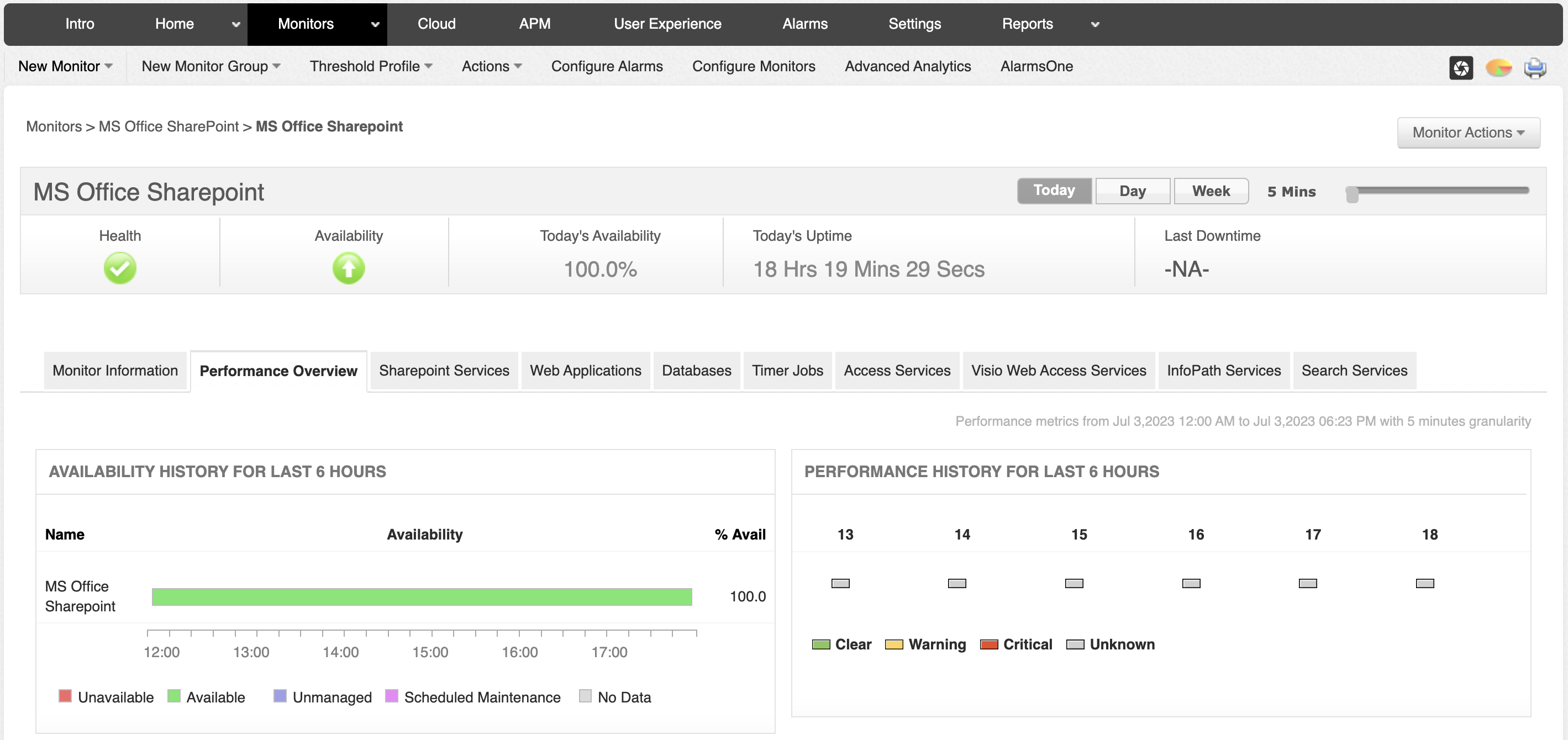 Applications Manager ofrece un completo dashboard de monitoreo de SharePoint que previsualiza el estado, la disponibilidad y el tiempo de respuesta de su servidor SharePoint. El monitor de SharePoint también proporciona una variedad de estadísticas de rendimiento a cuyos informes se puede acceder individualmente.