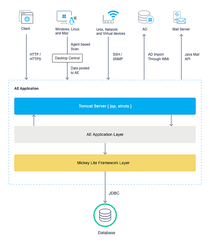 - Comunicación entre AssetExplorer y Endpoint Central (antes Desktop Central): AssetExplorer requiere la instalación de ManageEngine Endpoint Central para analizar equipos Windows, Linux y macOS. Endpoint Central permite la implementación de agentes que pueden conectarse al servidor. La transmisión de datos entre el servidor de AssetExplorer y Endpoint Central se realiza a través de SSL con autenticación basada en claves. Cualquier transferencia de datos desde la aplicación del agente al servidor se realiza mediante un protocolo de cifrado robusto, HTTPS.