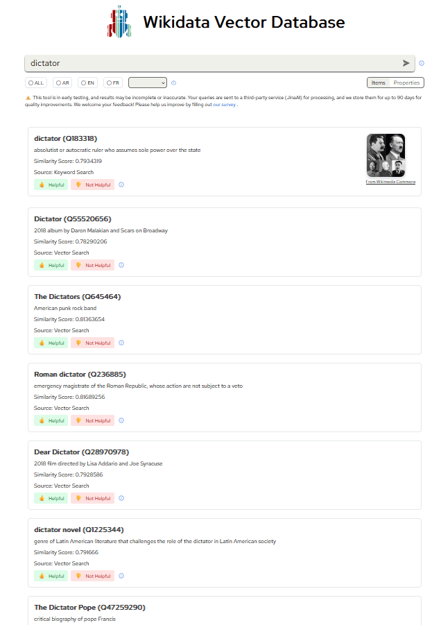 Encabezado por Wikimedia Alemania, Wikidata Embedding Project es un sistema que aplica una búsqueda semántica basada en vectores a la base de datos de Wikidata. Ha estado en desarrollo desde 2024 y está disponible desde el 1 de octubre de 2025.