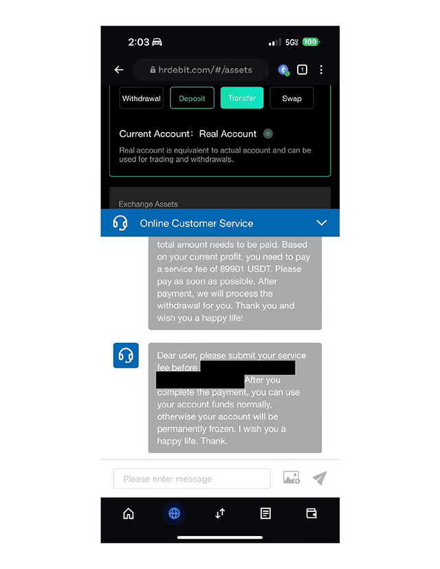 Servicio de 'soporte al cliente' de la estafa conocida como Hrdebit. Pretendía ser un mecanismo impulsado por IA, capaz de duplicar la cantidad invertida en poco tiempo.