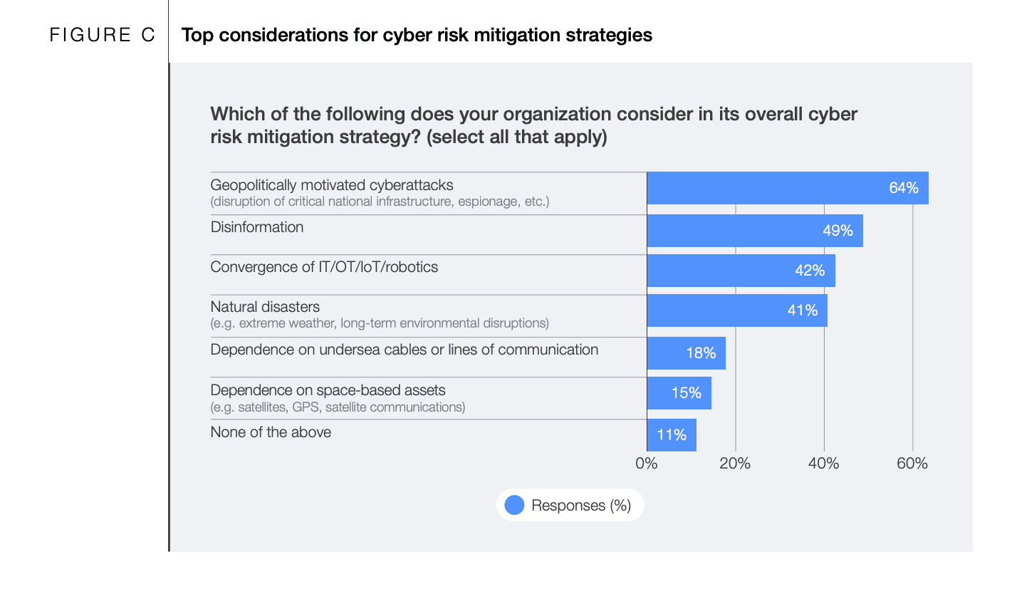 Alrededor del 64% de las organizaciones están teniendo en cuenta ciberataques motivados geopolíticamente, como la interrupción de infraestructuras críticas o el espionaje con fines empresariales o políticos.