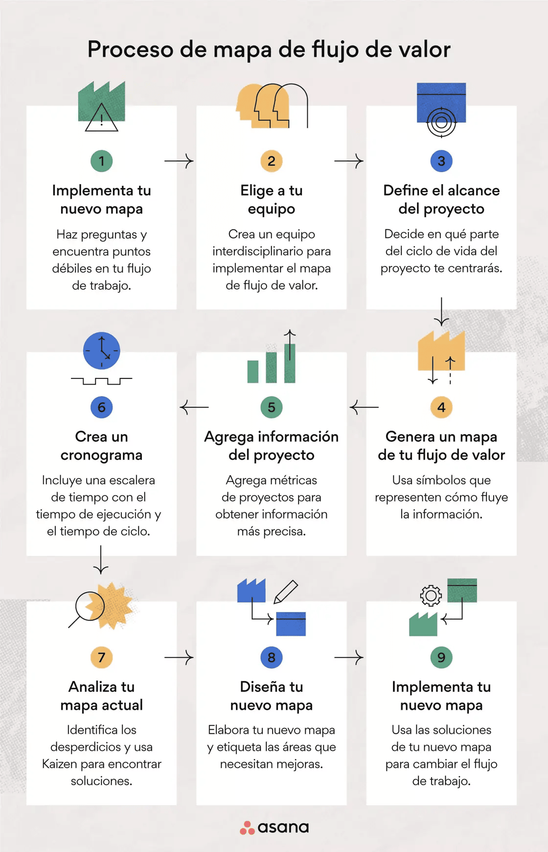 Si desea mejorar alguno de estos elementos o identifica otros detalles en sus flujos de trabajo, un VSM implica cuatro pasos básicos: