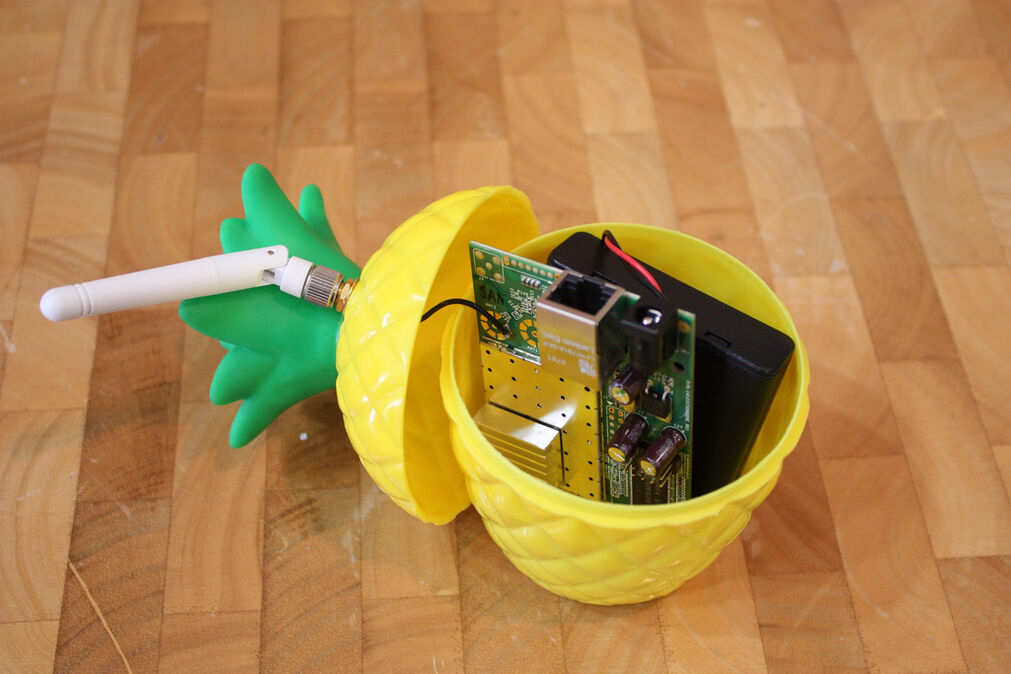 Ahora pueden suplantar sus redes de Wi-Fi por medio de una piña, una Wi-Fi Pineapple. Este dispositivo puede usarse para reforzar la seguridad, hacer pruebas de penetración y auditoría de redes Wi-Fi públicas o privadas, o ―si desea utilizarlo de forma malintencionada― para hackear.