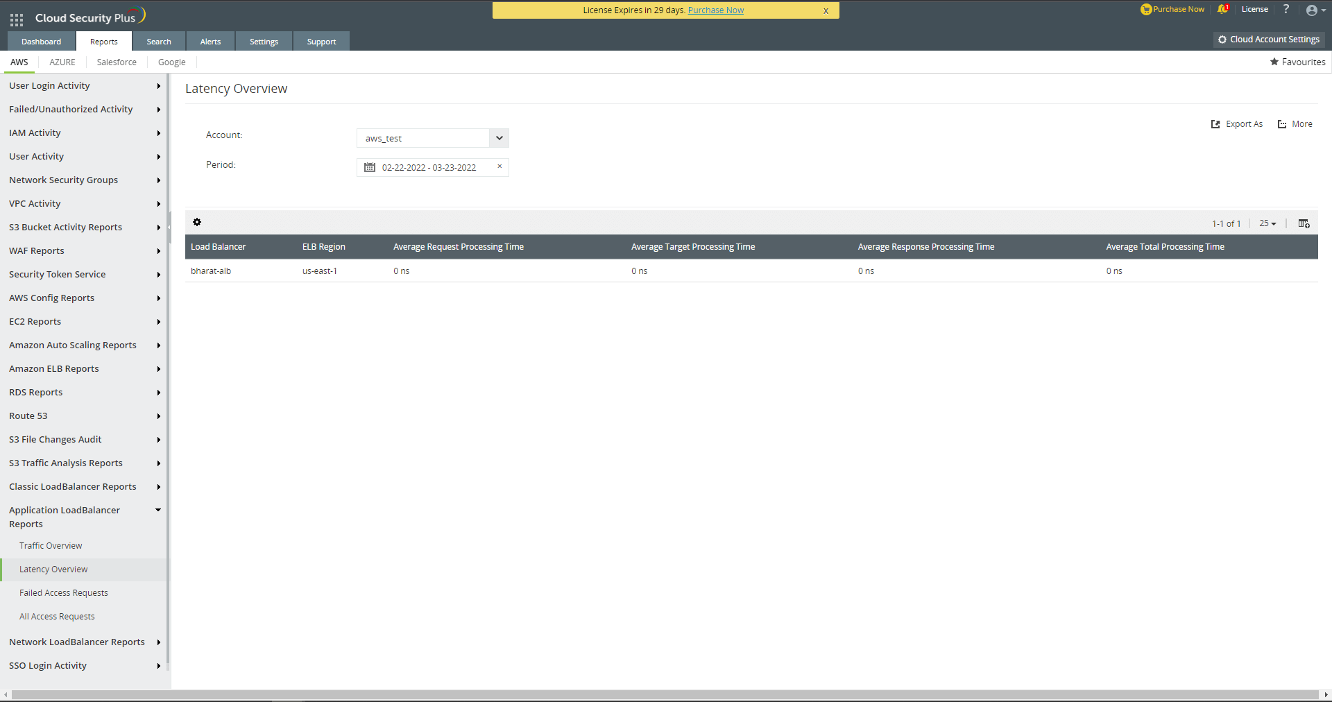 Cloud Security Plus lee los logs de acceso a ELB desde el bucket de S3 y utiliza la información para generar informes sobre el tráfico que se ejecuta mediante el equilibrador de carga. Con los informes de Cloud Security Plus' usted puede analizar patrones de tráfico y monitorear la eficiencia operativa de su ELB.